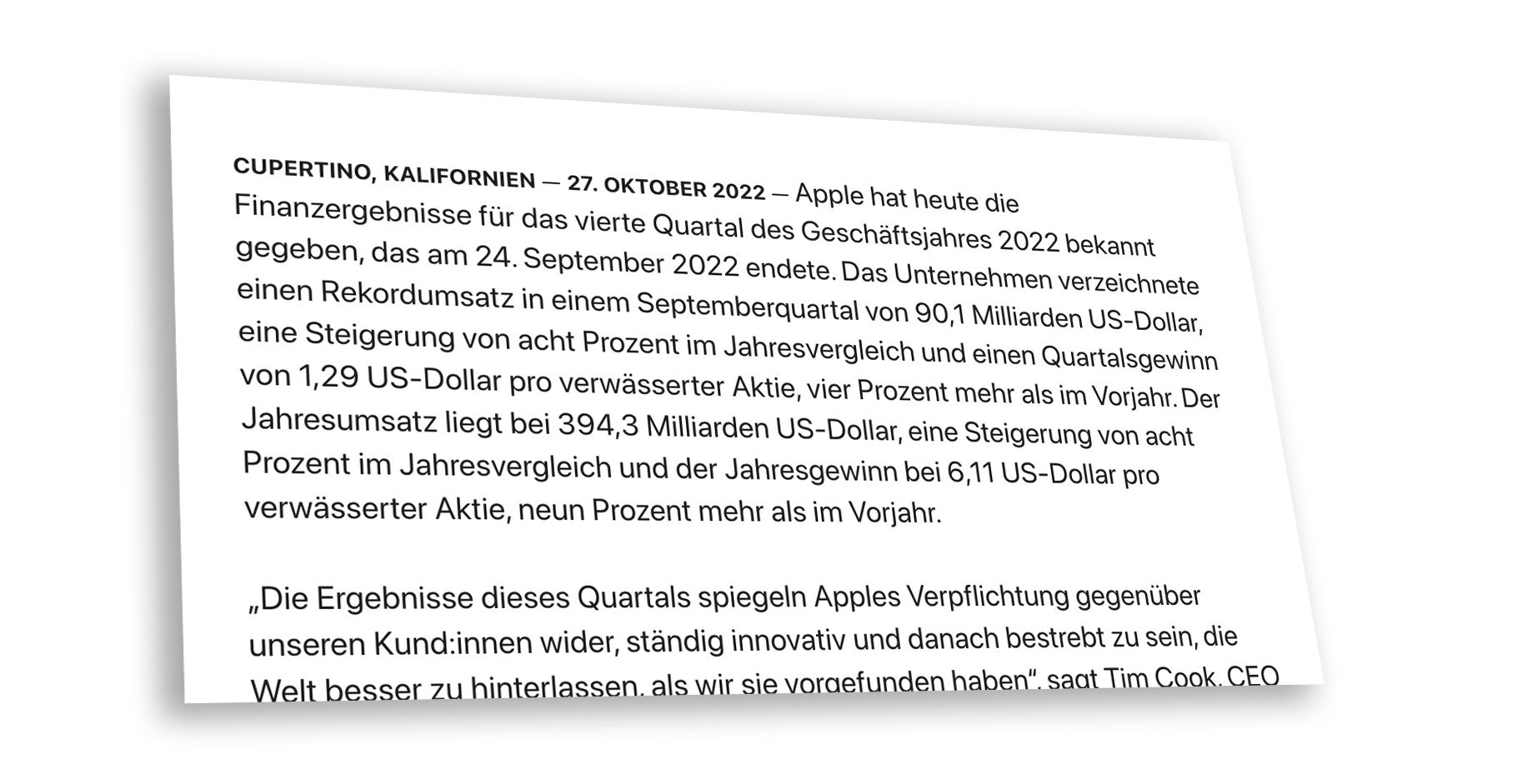 Im 4. Quartal 2022 machte Apple jede Minute einen Umsatz von 68.140 USD und einen Gewinn von 23.100 USD. Wenn man das auf eine Sekunde herunterbricht, sind das etwa 1.136 USD Umsatz und 385 USD Gewinn - das entspricht dem Preis eines Smartphones in jeder Sekunde (Quelle).