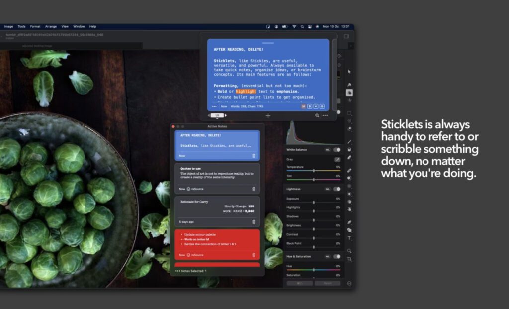 Mit der Sticklets App könnt ihr Notizen immer im Vordergrund halten, Text durch einfaches Drag-and-Drop auf das App-Symbol in eine neue Notiz verwandeln (und alle Formatierungen entfernen) sowie einen praktischen Taschenrechner nutzen. Notizen können sich auch für einzelne Projekte und Themen gruppieren oder als Mindmap darstellen lassen. Individuelle Farben für die einzelnen Textblöcke zeigen auf, welche Ideen, Listen und kopierten Texte zusammengehören. Es gibt viele Anwendungsmöglichkeiten für die Sticklets App und ich bin mir sicher, dass sie zahlreiche Aufgaben am Mac vereinfachen kann. Für umfangreiche Dokumente steht sogar eine App-weite Suchfunktion zur Verfügung, damit man schnell das Benötigte wiederfindet.