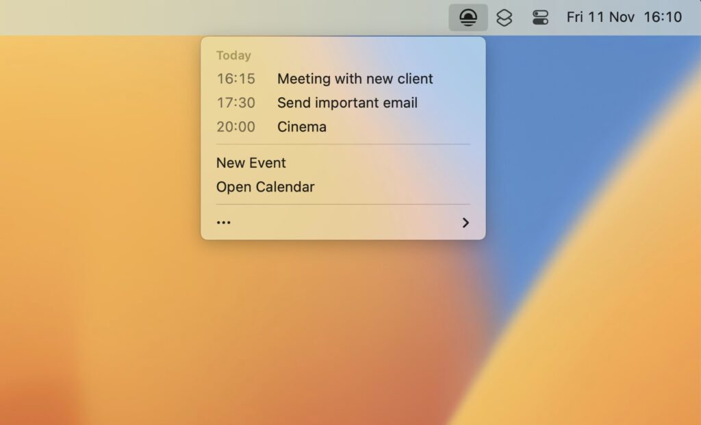 Auch die Today App stammt aus dem Bereich Produktivität, nimmt aber nicht so viel Platz ein. Sie setzt sich als Symbol auf der Menüleiste nieder und gibt von dort aus Auskunft über die Kalender-Einträge des aktuellen Tages. Das ist vor allem dann besonders hilfreich, wenn ihr nicht dauernd die displayfüllende Kalender-App öffnen und euch von den Einträgen der anderen Tage ablenken lassen wollt. Einfach auf das Today-Symbol klicken und schon erscheint eine Liste mit den Einträgen des Tages, die sich auch schnell wieder verbergen lässt. Vielleicht interessiert euch, dass der Entwickler hinter der App Sindre Sorhus ist. Den kennen wir ja schon von Jiffy, Shareful, Pure Paste und One Thing.