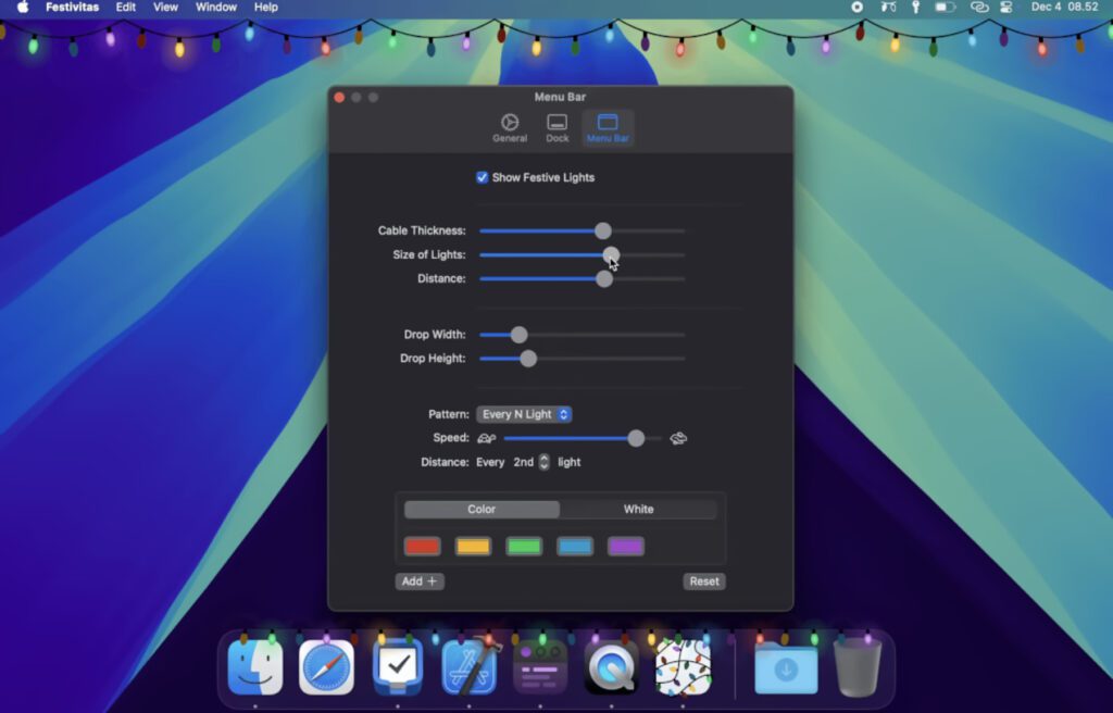Festivitas ist eine kleine Deko-App, welche das macOS-Dock sowie die Menüleiste mit jeweils einer bunten Lichterkette versieht. Die App bietet also einen optischen Mehrwert für die Adventszeit und die Weihnachtstage – sowie gegebenenfalls darüber hinaus. Andere Aufgaben erfüllt sie nicht; sie lässt sich aber umfangreich anpassen. Man kann die Festivitas App über die Plattform Gumroad kaufen, wo als Standardpreis 4,00€ abgefragt werden. Möchte man mehr geben, ist dies aber auch möglich. Zu beachten ist der Hinweis auf die Kompatibilität: es wird mindestens macOS 14.6 benötigt.