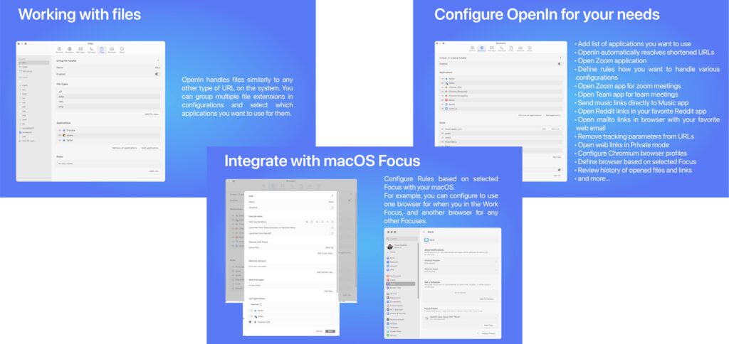 OpenIn ist eine umfangreich konfigurierbare App für das zielgerichtete Öffnen von Web-Links, mailto-Links, Dateien und mehr. Dank der Software können z. B. Links zum Schreiben einer E-Mail in einem selbstgewählten Mail-Client (z. B. Thunderbird oder Outlook) bzw. über die Gmail-Webseite geöffnet werden. Außerdem lassen sich für Web-Links individuelle Webbrowser (Safari, Chrome, Firefox, DuckDuckGo, etc.) einrichten. Dabei können für verschiedene Fokus-Einstellungen des Mac unterschiedliche Regeln eingerichtet werden. So kann über den macOS-Fokus eine Arbeits-, Freizeit- und Hobby-Umgebung mit jeweils passenden Apps geschaffen werden. Die OpenIn App gibt es im Setapp-Abo nebst 240+ weiteren App-Vollversionen für den Mac.