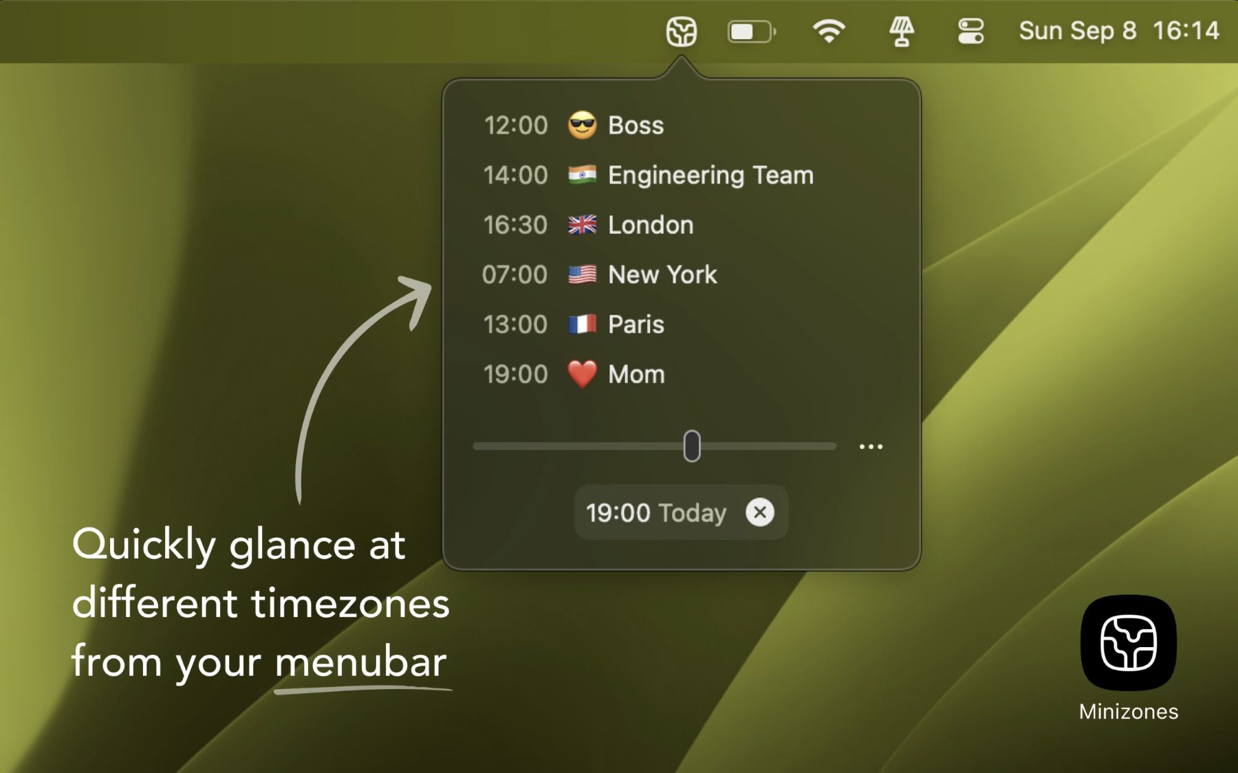 Die Minizones App ist ebenfalls eine Software, die sich in der Menüleiste niederlässt, um mit nur einem Klick die verlangten Informationen anzubieten. Angezeigt wird dabei die Uhrzeit in verschiedenen Zeitzonen. Neben der aktuellen Uhrzeit lässt sich über einen Schieberegler auch eine individuelle Zeit auswählen, um das entsprechende Zahlenäquivalent auf einem anderen Teil der Erde zu ermitteln. Die Zeitzonen lassen sich dabei übrigens individuell mit Namen und Emojis anpassen. Neben der Stadt oder dem Land und der dazugehörigen Flagge sind also auch Namen, Unternehmen, Events und so weiter möglich. Die App ist ab macOS 13 nutzbar und für 3,99€ im Mac App Store zu haben.