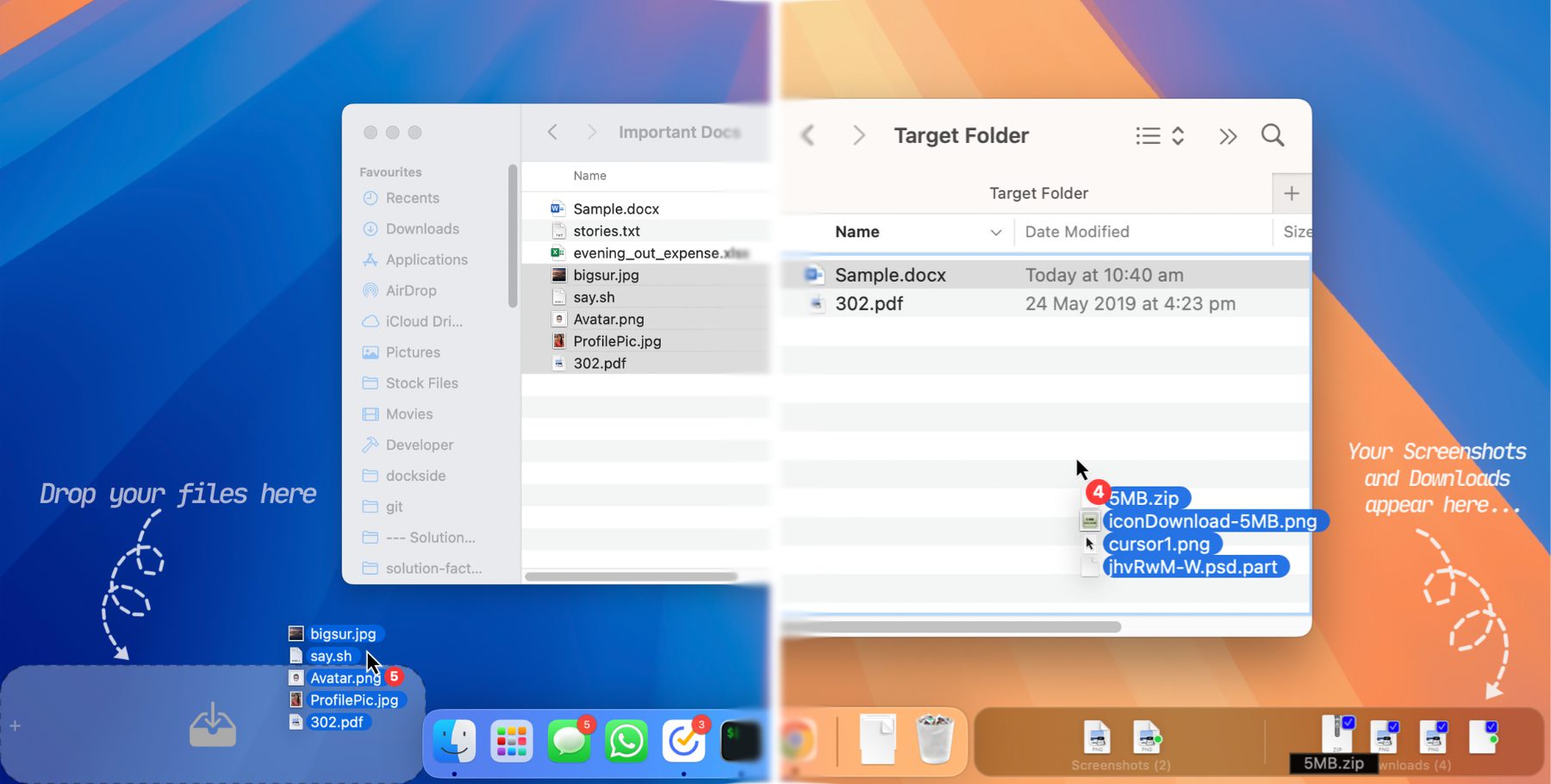 Mit der Dockside App holt man sich einen Ablageort für Dateien, Webseiten, Text und weitere Inhalte als zusätzliches Oberflächen-Element auf den Mac. Ab macOS 13 heftet Dockside jeweils einen Bereich links und rechts des Docks an den unteren Bildschirmrand des Mac an. Links können dabei Dateien zwischengelagert, Text in Reinform abgelegt und weitere Inhalte geparkt werden. Sie können dann individuell aufgerufen und verschoben werden. Rechts vom Dock ist Platz für erstellte Screenshots und aktuelle Downloads. Wer also für Kreativarbeiten, Recherche, Programmierung, Design o. ä. oft mit vielen Inhalten zu tun hat und diese oft ihren Ablageort ändern, kann von Dockside profitieren.