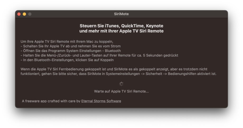 Die SiriMote App bietet euch ab macOS 10.12 die Möglichkeit, die Fernbedienung eures Apple TVs zur Steuerung des Mac zu nutzen. Dabei können zwar nicht alle möglichen System- und App-Funktionen auf die Tasten des Bluetooth-Geräts gelegt werden, aber nativ zumindest jene der F-Tasten, die für die Mediensteuerung gedacht sind. Entsprechend lässt sich während der Musik-Wiedergabe die Lautstärke anpassen, der vorige oder nächste Titel ansteuern und so weiter. Weiterhin könnt ihr die Apple-TV-Fernbedienung mit dieser App für Keynote-Präsentationen, für ProPresenter, PowerPoint, Kodi und mehr nutzen. Gemacht ist SiriMote sowohl für Intel-Macs als auch für Mac-Modelle mit Apple Silicon. Allerdings muss mindestens Bluetooth 4.0 verbaut sein.