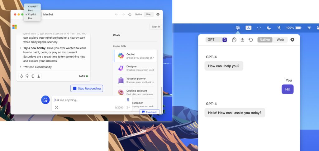 MacBot ist eine native App für macOS, die ihr kostenlos nutzen könnt, um schnell zwischen ChatGPT von OpenAI, Copilot von Microsoft, Bard von Google und weiteren Chatbots / KIs zu wechseln. Die dahinter stehende „The MacBro Group.“ verspricht dabei, dass keine Daten an sie übermittelt und gesammelt werden. Außerdem gibt es weder Werbung noch Abonnements; alle Updates sind überdies kostenlos. Auf der Download-Seite liest man aktuell, dass Beta-Tests für eine Business-Variante der App geplant sind. Wahrscheinlich soll dann mit dieser Geld eingenommen werden. Für EU- und Kanada-User gibt’s den Hinweis, dass die native Ansicht der App eventuell bei Bard aus Datenschutzgründen nicht funktioniert. Hier kann man die Web-Ansicht nutzen. Zudem gibt es die Möglichkeit, MacBot über die Menüleiste zu verwenden.