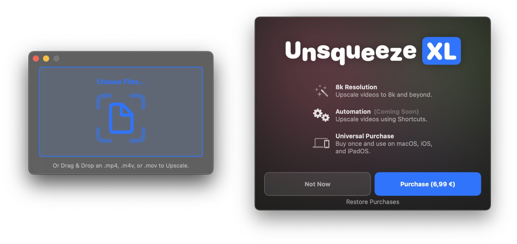Unsqueeze ist in den letzten Wochen auf den unterschiedlichsten Apple- und Mac-Fachseiten präsentiert sowie gelobt worden. Denn die Software, mit der man niedrig aufgelöste Videos auf bis zu 8K oder höher hochskalieren kann, nutzt moderne Upscaling-Algorithmen im Einklang mit Apples Grafik-Schnittstelle „Metal“. Man kann die Unsqueeze App bis zu einem gewissen Maß kostenlos nutzen, der In-App-Kauf „Unsqueeze XL“ kostet allerdings 9,99€ (teilweise als Aktion günstiger). Meine Beobachtungen: die große Zieldatei wird nur scharf, wenn auch das Quell-Video scharf ist. Ein gut fokussiertes 1080p-Video kann also ansehnlich in 4K oder 8K übertragen werden. Ein 480p-Video mit vielen Fragmenten und Bildrauschen wird allerdings nicht auf magische Weise in ein HD- oder 4K-Meisterwerk verwandelt.