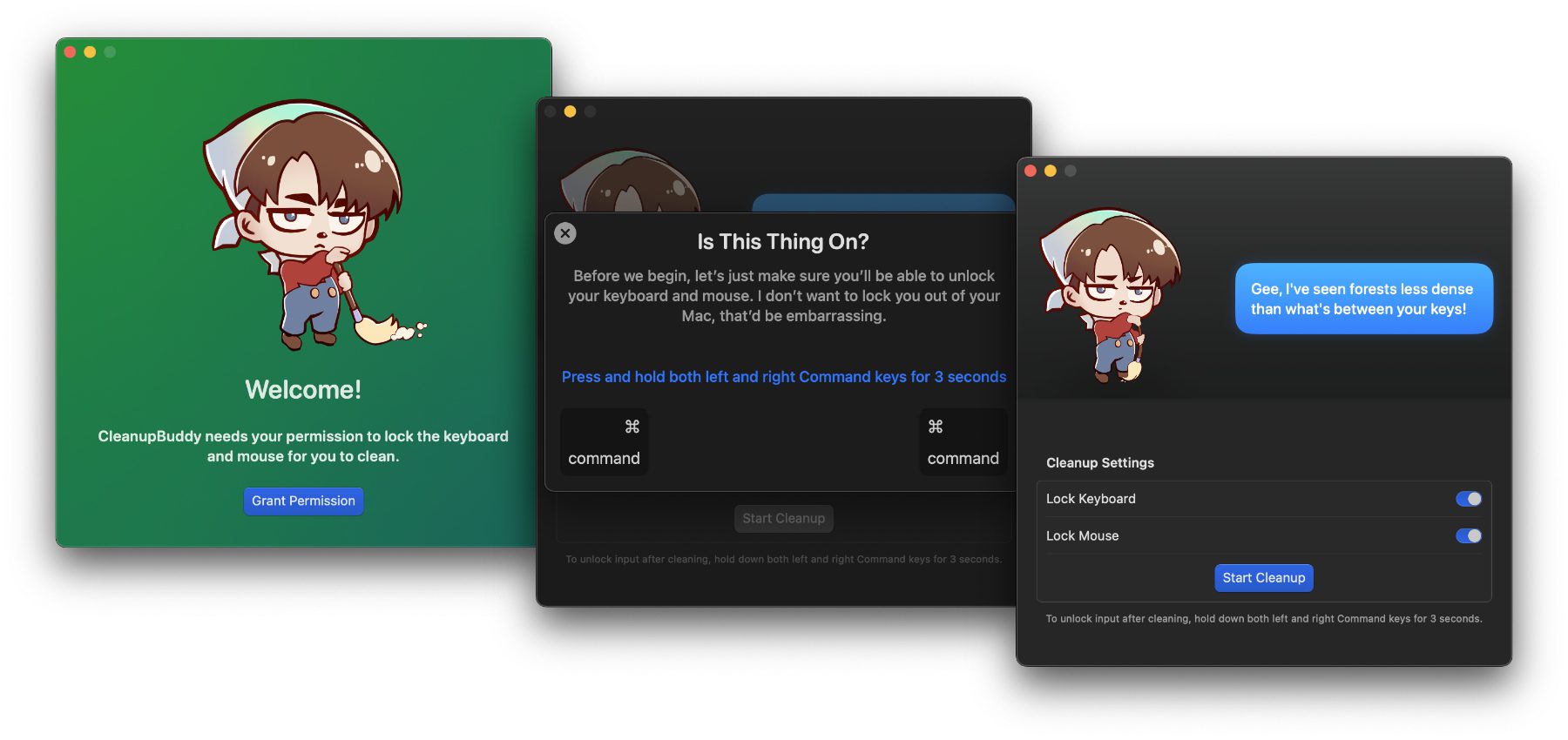 CleanupBuddy sperrt die Tastatur und die Maus, sodass keine Eingaben vom Mac angenommen werden. Das ist besonders praktisch, wenn man die MacBook-Tastatur reinigen will. Während man alte Modelle des Apple-Laptops dafür einfach ausschalten kann, gehen aktuelle Modelle bei jedem Tastendruck (egal welche Taste) an. Also kann man sie auch direkt im Betrieb sauber machen und vorher die Eingaben mit CleanupBuddy blockieren. Um die Tastatur wieder freizugeben, hält man einfach die zwei command-Tasten für drei Sekunden gedrückt. Die kleine Software kommt mit einem frechen Chibi-Anime-Charakter daher, der mich an Harvest Moon erinnert. Er lässt Sprüche zu eurer verdreckten Tastatur da, die euch zum Saubermachen motivieren sollen.