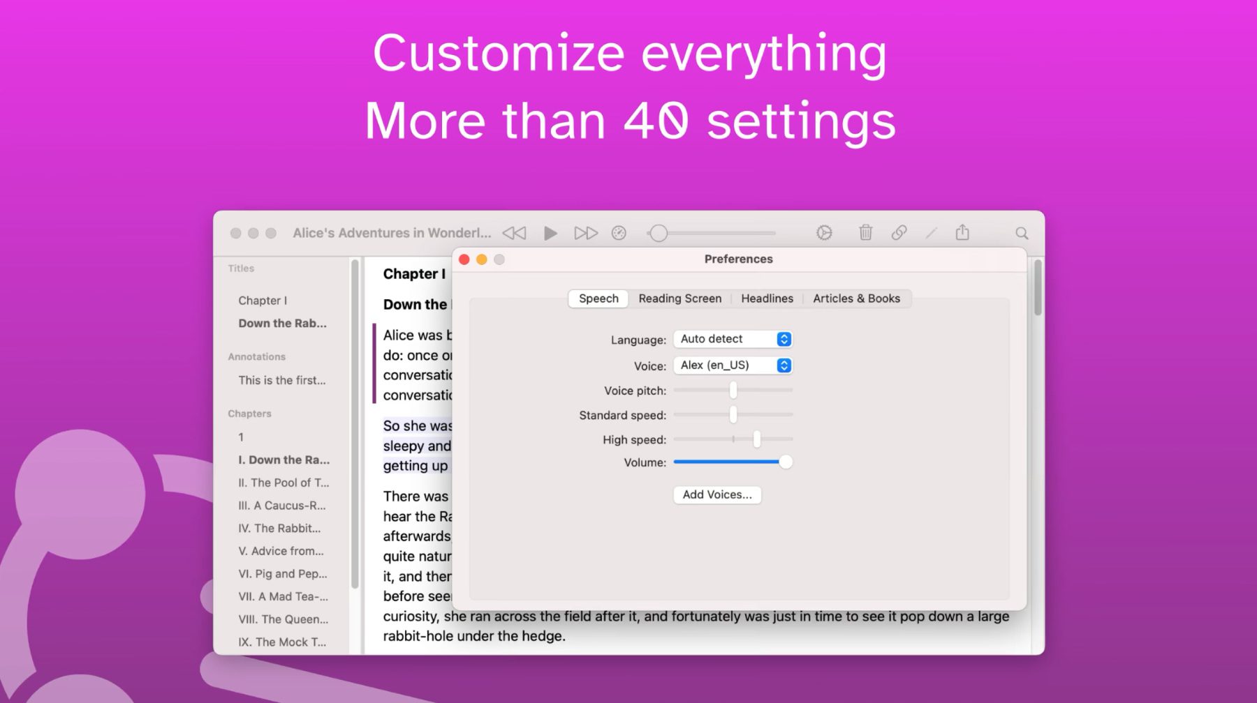 Speech Central ist eine Text to Speech App, die dabei hilft, Texte auf dem Mac vorzulesen. Dabei kann Geschriebenes aus PDF-Dokumenten, Dateien von Textverarbeitungsprogrammen, E-Books, Webseiten und RSS-Feeds vorgelesen werden. Zudem kann der Text nicht nur ad hoc vorgetragen, sondern auch für die spätere Wiedergabe als Audio-Datei gespeichert werden. Die Lesestimme kann dabei in der Höhe, der Geschwindigkeit und im Hinblick auf andere Faktoren angepasst werden. Das Gute daran: Die App gibt es im Abonnement von Setapp. Das Angebot von MacPaw könnt ihr 7 Tage kostenlos testen und dabei alle Vollversionen aus den unten aufgeführten Kategorien nutzen.