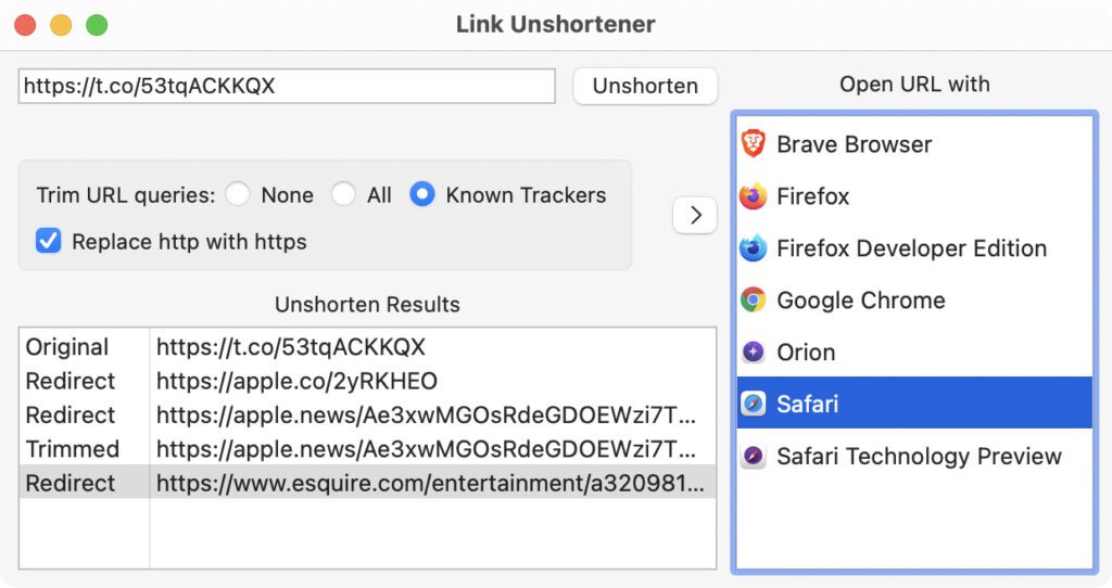 Die Link Unshortener App für den Apple Mac hilft euch dabei, eingekürzte Links auf ihre Ziele hin zu überprüfen sowie Tracking-Parameter aus ihnen zu entfernen. Zudem werden die installierten Webbrowser angezeigt, um direkt auswählen zu können, in welchem man den Link letztendlich öffnen möchte. Die Software ist also hilfreich, wenn ihr öfter mit „tinyurl.com“- oder „bit.ly“-Links zu tun habt, Links aus vermutlichen Fake-Mails prüft oder Social-Media-Links erhaltet. Denn z. B. Twitter-Links zu auf Twitter (bzw. X) verlinkten Seiten lauten oft nur „t.co/Zeichenfolge“ – Link Unshortener zeigt, wo die Reise damit wirklich hingeht.