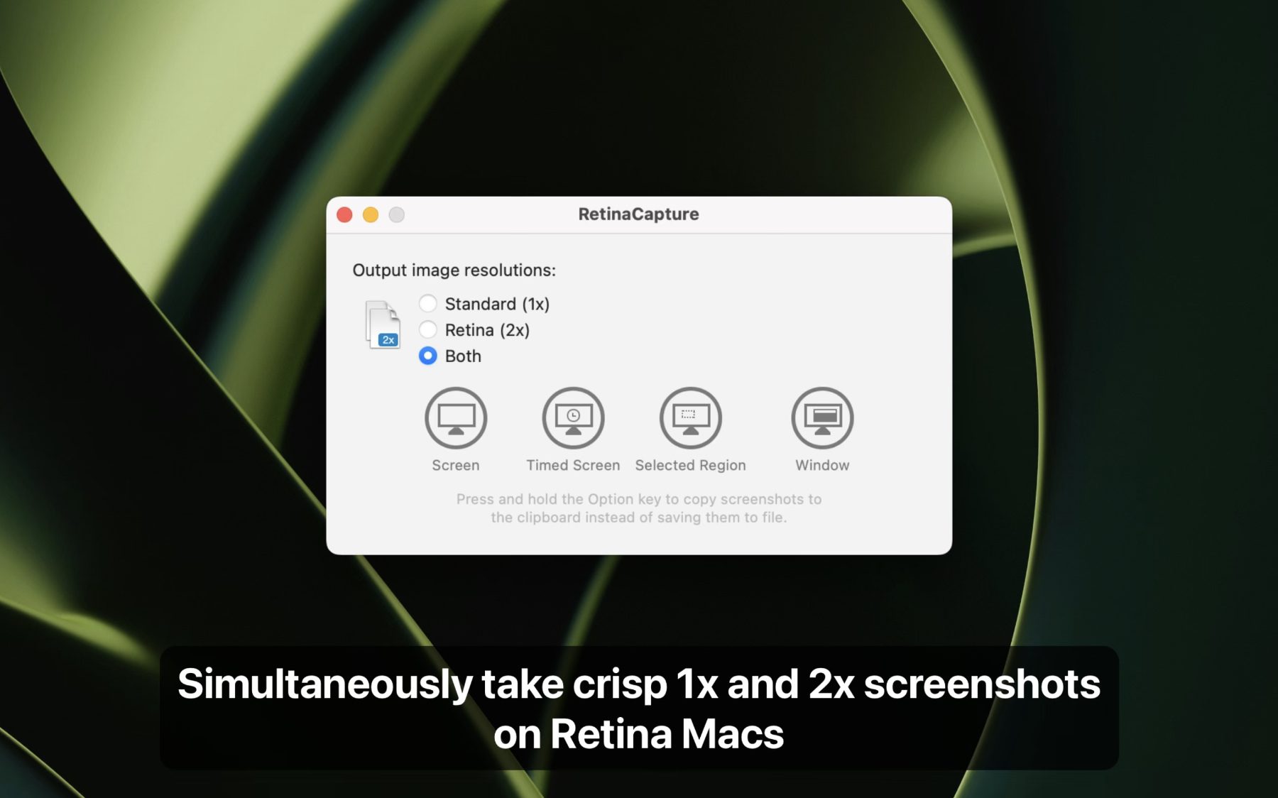 Die RetinaCapture App für den Apple Mac ist eine praktische Hilfe für die Aufnahme verschieden großer Screenshots, vor allem an Retina-Displays mit hoher Auflösung. Denn neben oder anstatt der großen Bildschirmaufnahme in Retina-Auflösung kann eine kleinere Aufnahme in halber Auflösung realisiert werden. Jeder Screenshot kann dabei individuell in einer der beiden Größen oder gleichzeitig in beiden Größen erstellt werden. Zudem ist die Auswahl des gesamten Bildschirms, eines selbst definierten Bereichs oder eines Programmfensters möglich. Speichern lassen sich die Aufnahmen als JPEG, PNG und TIFF. RetinaCapture kann als Menüleisten-App genutzt werden.