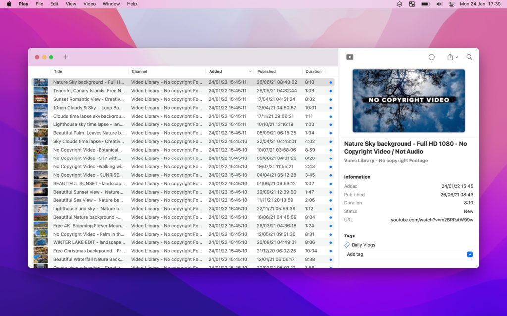 Schaut ihr viele Videos auf YouTube und seid mit den Sortier- und Speicher-Möglichkeiten der Webseite nicht ganz zufrieden, dann könnte euch die Play App weiterhelfen. In der App könnt ihr YouTube-Videos verwalten, indem ihr z. B. Tags, Shortcuts und andere Abkürzungen zum bevorzugten Content nutzt. Außerdem hilft euch Play dabei, ein YouTube-Video als Widget zu platzieren, sodass ihr es neben anderen Aktivitäten abspielen bzw. im Hintergrund laufen lassen könnt. Die günstige App findet ihr im offiziellen Mac App Store, weitere Infos gibt es auf der Webseite des Entwicklers. Dort findet ihr auch den Hinweis auf die iOS-, iPadOS- und tvOS-Version.