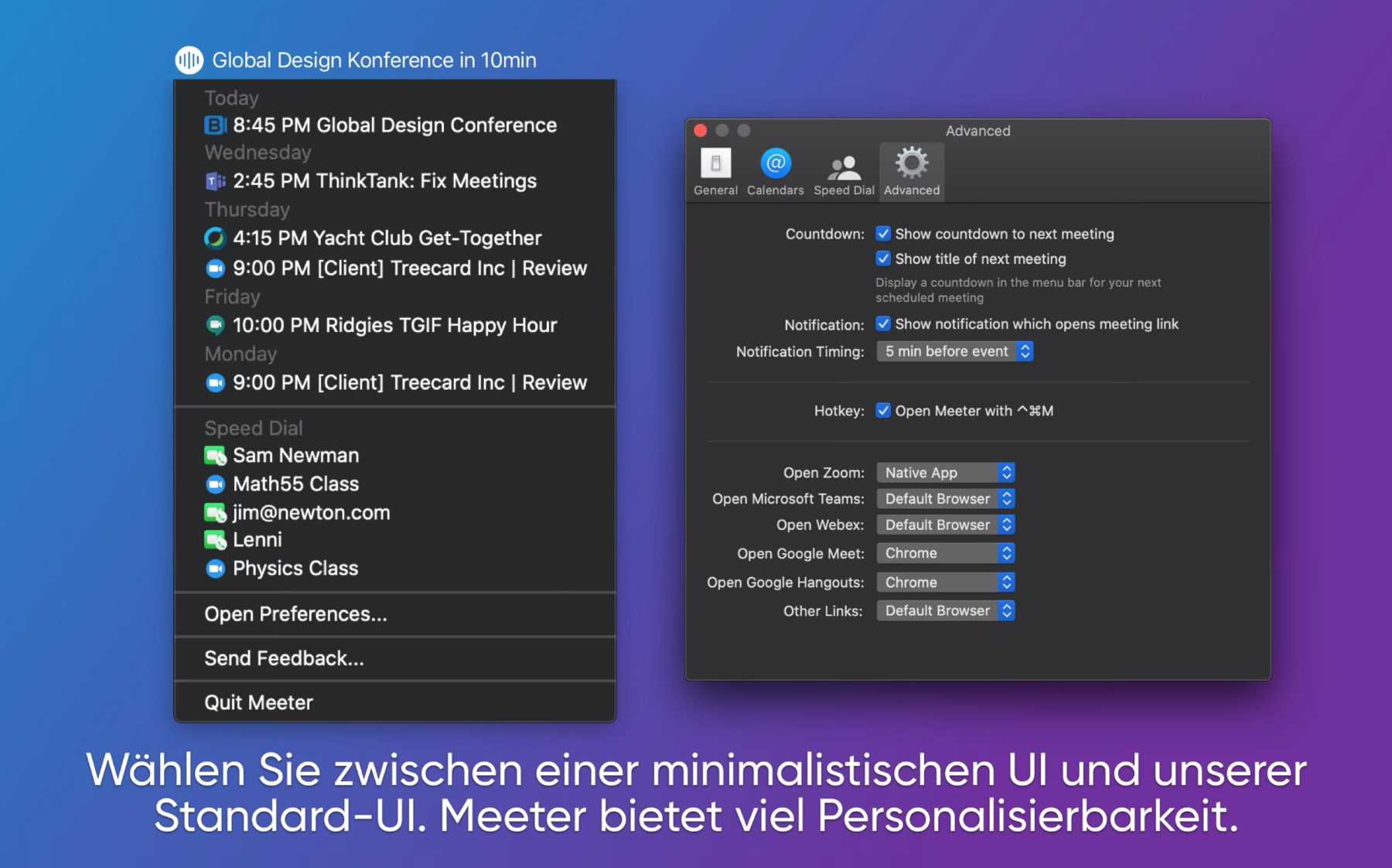 Mit der Covid-19-Pandemie zogen die Videokonferenzen in die unterschiedlichsten Wirtschaftszweige ein. Und auch mit Familie und Freunden hält man nun öfter mal auf digitalem Weg Kontakt. Bei hohem Videocall-Aufkommen kann man da gerne mal den einen oder anderen Termin vergessen. Die Meeter App für macOS soll dieses Problem beheben, indem die bevorstehenden Anrufe übersichtlich aufgelistet in der Menüleiste platziert werden. Zudem gibt es Push-Mitteilungen, die auf anstehende Termine hinweisen. Außerdem können Videoanrufe direkt aus dem Tool heraus wahrgenommen werden; es ist mit vielen gängigen Konferenz-Apps kompatibel.
