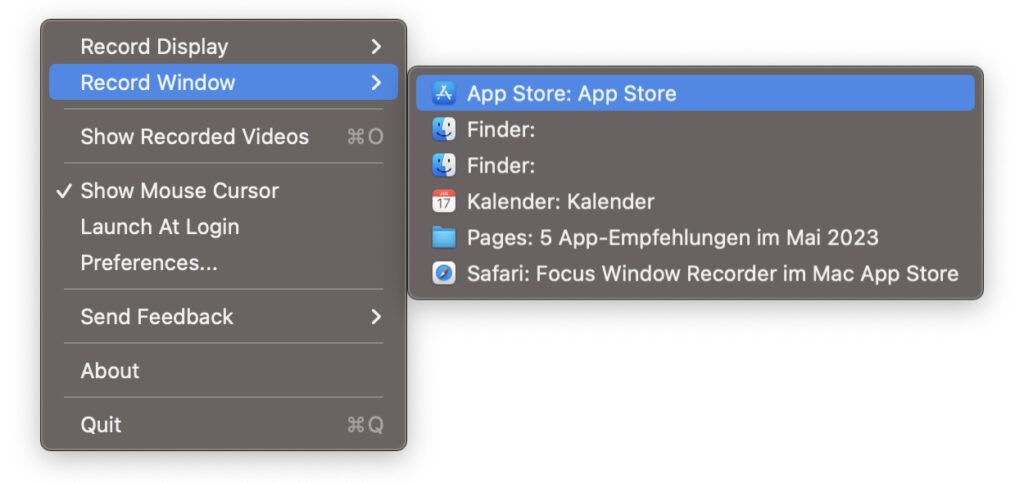 Die im App Store „Focus Window Recorder“ genannte, aber auf dem Mac einfach nur als „Focus Recorder“ installierte App hilft euch beim Aufnehmen einzelner Displays oder Programmfenster. Benötigt ihr also ein Video, das die Aktivitäten auf einem bestimmten Bildschirm oder von einer einzelnen App zeigen soll, könnte sich der kostenlose Download für euch lohnen. Nach der Installation, dem Freigeben des Bildschirmzugriffs und der Wahl des Speicherorts für Bildschirmvideos findet ihr den Focus Recorder als Kreissymbol in der Menüleiste. Von dort aus könnt ihr einzelne Displays und Programme auswählen, die aufgenommen werden sollen. Es lassen sich dafür verschiedene Optionen festlegen, z. B. ob der Mauszeiger im Video sichtbar sein soll.