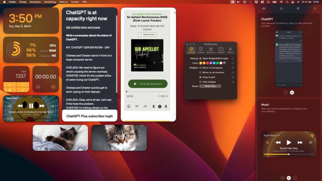 Bleiben wir zum Abschluss direkt beim Mac-Schreibtisch. Klickt man oben rechts auf die Uhr oder zieht auf dem Trackpad mit mehreren Fingern vom rechten Rand nach links, dann kann man sich zwar Widgets anzeigen lassen. Diese sind aber nicht dauerhaft zu sehen. Wer bestimmte Ordner, Kalender-Übersichten, System-Daten, einen ChatGPT-Schnellzugriff, die Musikwiedergabe, eine größere App-Auswahl als im Dock, den Taschenrechner, das Wetter, eine größere Uhrzeit-Anzeige und / oder dergleichen dauerhaft auf dem Schreibtisch haben will, sollte sich mal WidgetWall anschauen. Die WidgetWall App findet ihr unter anderem im App-Paket von Setapp. Da bekommt ihr mittlerweile über 240+ Vollversionen für lediglich 9,99 € im Monat.