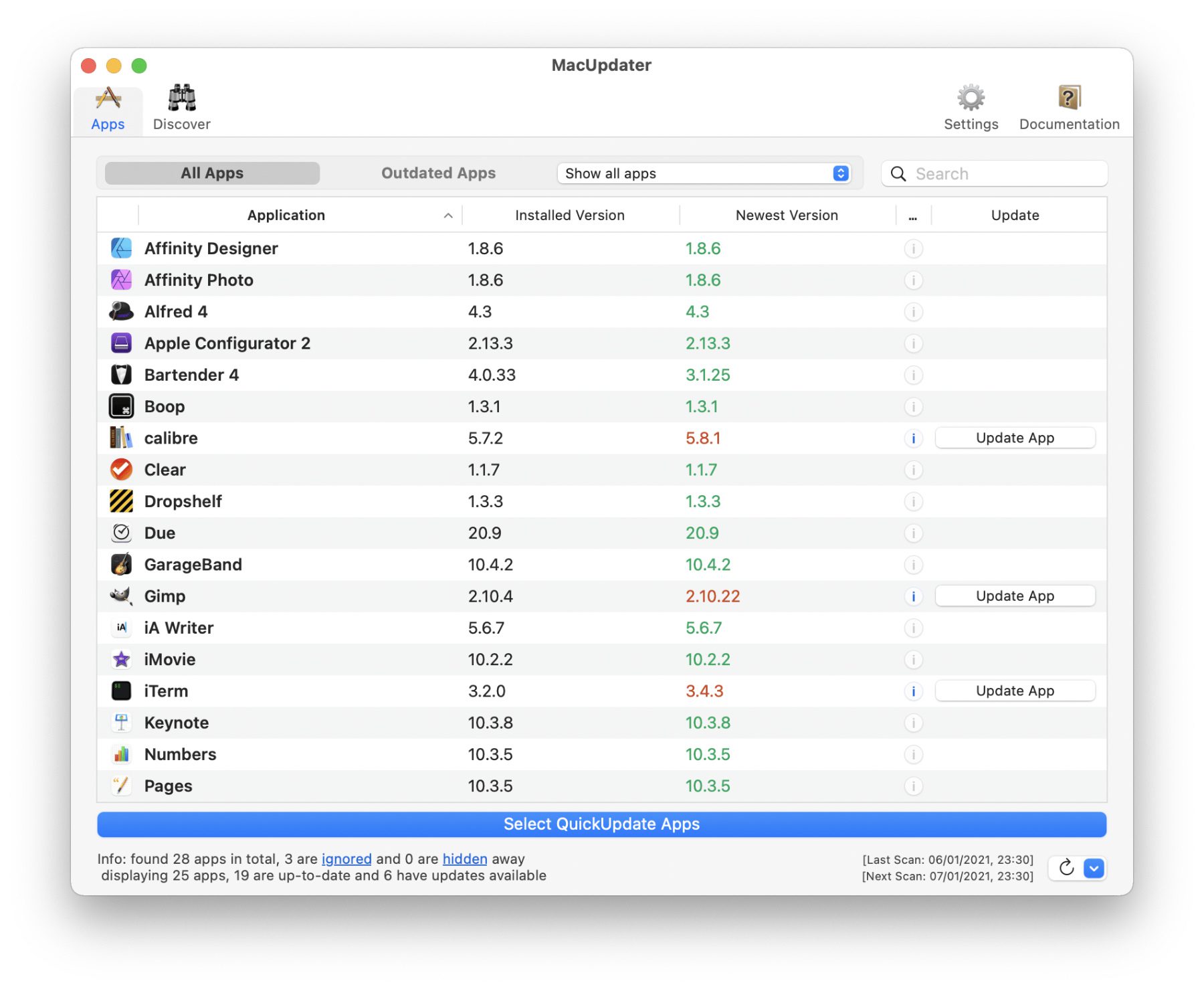 MacUpdater ersetzt eine wichtige Funktion für aus dem Internet geladene Apps, die es sonst nur im Mac App Store gibt: Informationen zu allen verfügbaren Updates gesammelt anzeigen. Denn wenn ihr eine App von einer Webseite statt aus dem App Store ladet und installiert, dann kann es sein, dass ihr Updates verpasst. Die MacUpdater App listet die auf dem Mac installierten Apps auf und zeigt übersichtlich, für welche man sich eine neue Version herunterladen kann. In der Gratis-Version kann man die Apps nur nach Updates scannen; die Bezahl-Versionen enthalten One-Click-Updates für 5.000 verschiedene Apps sowie noch viele weitere Optionen.