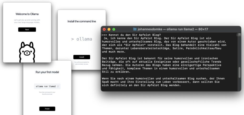 Ollama ist eine App, die ihr ab macOS 11 Big Sur am Apple Mac nutzen könnt, um das Code-Llama-Sprachmodell von Meta, welches kostenlos als Open-Source-Material verfügbar ist, zu nutzen. Nach dem Download von der offiziellen Webseite (s. u.) entpackt ihr die App aus einem .zip-Archiv. Beim ersten Start gibt es eine kleine Einführung und den Hinweis auf die Installation der Befehlszeile „> ollama“ – denn statt einer grafischen Oberfläche sorgt Ollama dafür, dass ihr Code Llama über das Terminal nutzen könnt. Mit dem ersten Befehl „ollama run llama2“ ladet ihr das 3,8 GB große Sprachmodell. Anschließend können Prompts eingegeben, Fragen gestellt und andere Eingaben zur Beantwortung getätigt werden. Beachtet, dass Code Llama als KI-Chatbot viel Quatsch erzählen kann (s. Screenshot).