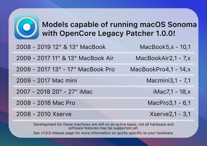 Da mir die Ressourcen fehlen, die Installation von macOS 14 Sonoma auf nicht unterstützten Mac-Modellen zu untersuchen, gibt es keinen Einzelbeitrag zu dieser App. Stattdessen möchte ich hier kurz auf den OpenCore Legacy Patcher eingehen, der derzeit in der Version 1.0.1 vorliegt. Er hilft nicht nur, Sonoma auf alten Mac-Modellen zu installieren, sondern kümmert sich auch um die Hardware-Unterstützung. So wird z. B. der Support für USB 1.1 auf alten Maschinen zurückgeholt. Beachtet aber, dass es zu massiven Leistungseinbrüchen und anderen Problemen kommen kann, da alte Macs nicht für moderne Systeme gemacht sind – und umgekehrt die neuen Systeme nicht für die alte Hardware.