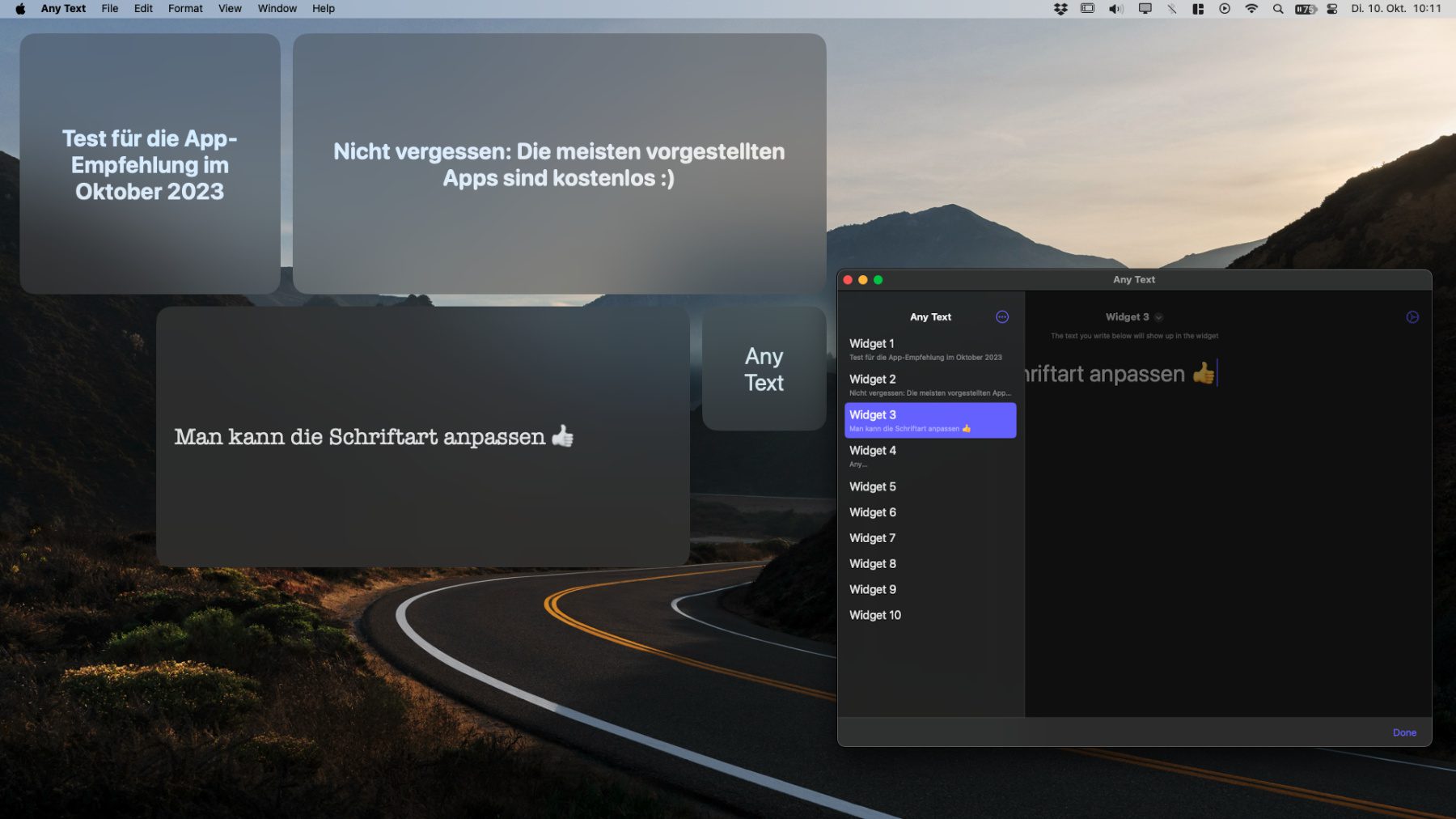 Die Any Text App habe ich euch letztes Jahr schon einmal für das iPhone vorgestellt. Denn sie bietet eine Möglichkeit, beliebigen Text als Widget auf den Sperrbildschirm zu bringen. So kann man schnell und einfach die Einkaufsliste einsehen oder Kontakt-Informationen anzeigen lassen, falls man das iPhone verliert und von den Finder/innen kontaktiert werden möchte. Letztes habe ich aber die Anwendung der App am Apple Mac (mit Apple-Chip) gesehen. Any Text als Mac-App bringt euch ab macOS Sonoma mit den darin nutzbaren Schreibtisch-Widgets eine Möglichkeit, Texteinblendungen auf dem Desktop unterzubringen – Notizen, Erinnerungen, To-Do-Listen, Motivationssprüche, und so weiter.