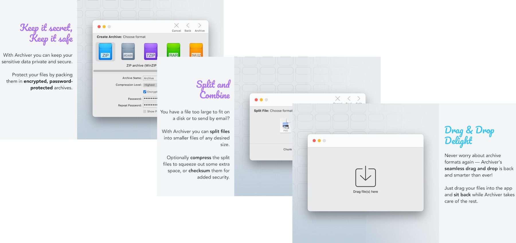 Es gibt verschiedene Apps zum Packen und Entpacken von Archiven am Apple Mac. Eine davon ist die leicht zu bedienende Archiver App. Diese Software hilft nicht nur dabei, Dateien in Archive zu packen oder Archivdateien auseinanderzunehmen. Auch können mit dem Archiver große Dateien bzw. große Ordner in kleinere Archive aufgeteilt werden. Das hilft beim Versenden per E-Mail oder bei Upload-Beschränkungen für Einzeldateien in Messenger-Apps, Cloud-Speichern und dergleichen mehr. Weiterhin können Archive kombiniert sowie Passwörter für die Pakete festgelegt werden. Die App lässt sich z. B. übers Setapp-Abo beziehen, nebst 240+ weiteren App-Vollversionen für den Mac.