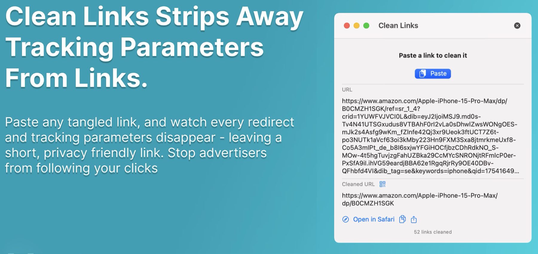 Mit Clean Links gibt es eine kostenlose Möglichkeit, Kurzlinks auf ihr tatsächliches Ziel hin zu untersuchen und QR-Codes sicher zu öffnen. Neben dem Mac wird die App dabei auch für den mobilen Einsatz am iPhone und iPad angeboten. Die Nutzung ist denkbar einfach: Link eingeben oder QR-Code scannen und Informationen zu den damit verschlüsselten Zielen erhalten. Neben der oft langen URL mit Tracking-Parametern und ähnlichen Inhalten wird auch die „Cleaned URL“, also die bereinigte Web-Adresse ausgegeben, die datensparsamer genutzt werden kann. Der Download ist für alle Plattformen über den App Store möglich.