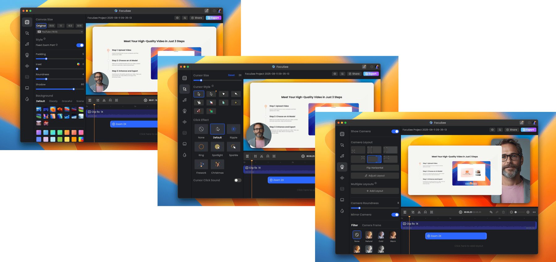 Am Mac Bildschirmaufnahmen und die Webcam in moderner Machart zusammenführen, das geht mit den verschiedensten Apps. Eine davon ist FocuSee. Sie bietet verschiedene Voreinstellungen, Bildschirm- und Kamera-Kombinationen, die Anpassung des Mauszeigers inklusive der Hervorhebung von Klicks, und einiges mehr. Neben der vollständigen Bildschirmaufnahme können dabei auch individuelle Bildausschnitte und einzelne Apps für die Aufnahme ausgewählt werden. Vor dem Export der fertigen Videodatei kann diese geschnitten und bearbeitet werden. FocuSee kann u. a. als Teil des umfangreichen App-Pakets Setapp in Anspruch genommen werden.