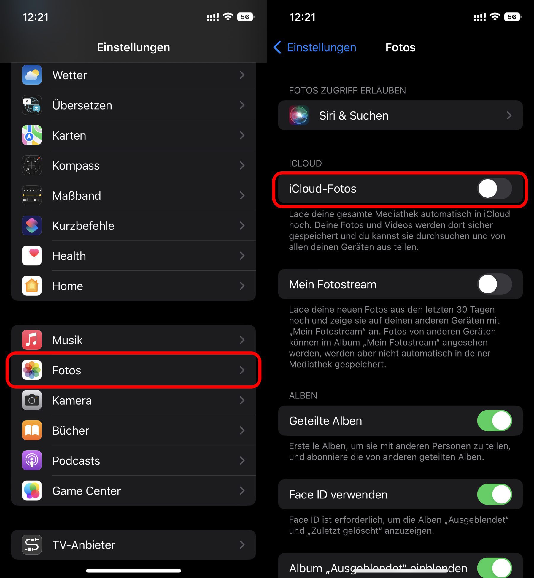 Zitat: „Stellt unter iCloud die Verwendung mobiler Daten oder direkt den Regler bei „iCloud-Fotos“ auf Aus“.