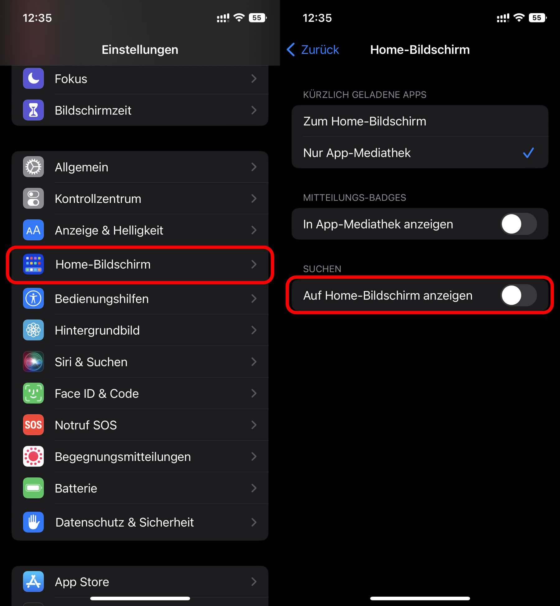 - Deaktiviert unter „Suchen“ den „Auf Home-Bildschirm anzeigen“-Schieberegler