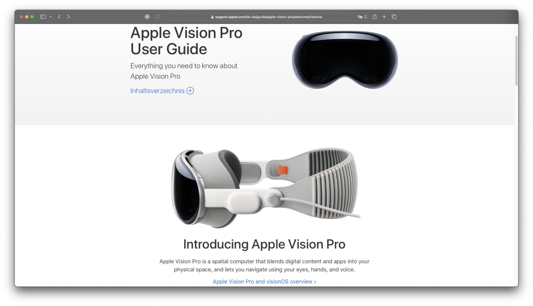 Denn dort werden, trotz deutscher Spracheinstellung (s. „de-de“ in der URL), der „Apple Vision Pro User Guide“ und die weiteren Texte auf englisch angezeigt. Nur der „Inhaltsverzeichnis“-Link ist auf deutsch. Das Inhaltsverzeichnis ist dann wiederum auf englisch, außer es wird einer der Punkte ausgewählt, dann steht die übersetzte Version zur Verfügung. Ein Fehler, der sicher bald korrigiert wird.