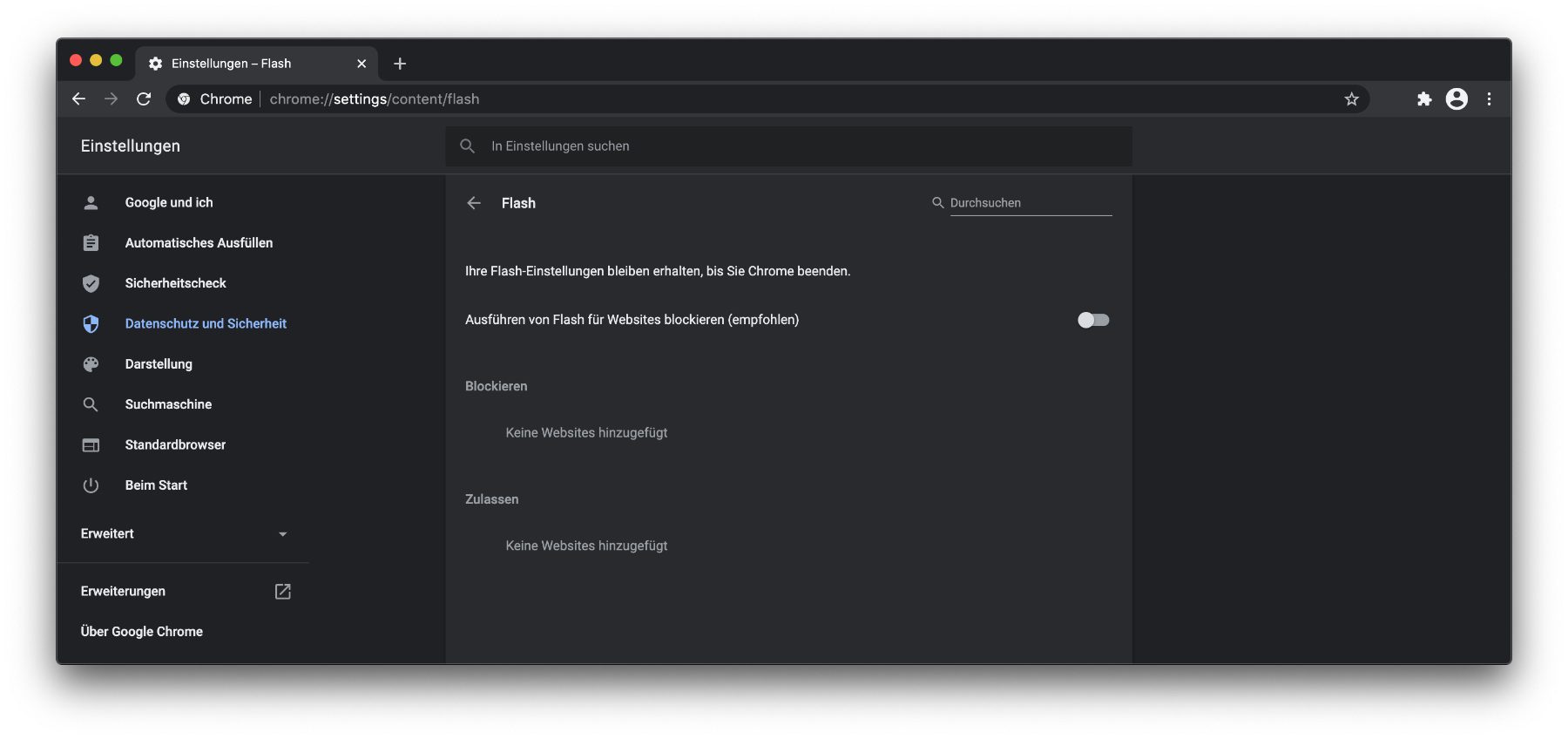 - Den Regler nach links setzen (deaktivieren), um Flash für Websites zu blockieren