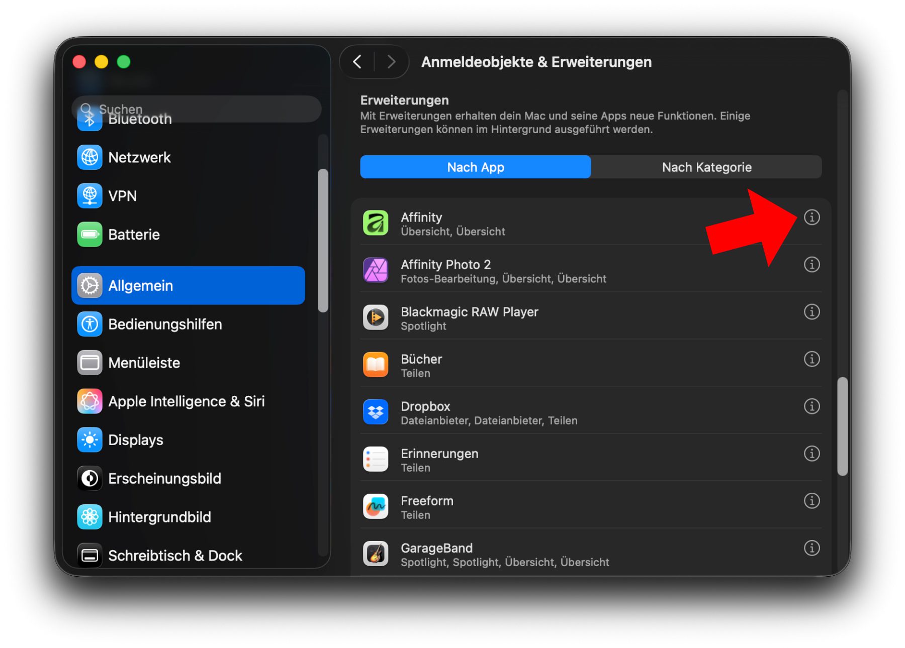 - Zum Bereich „Erweiterungen“ scrollen und das eingekreiste „i“ neben Affinity anklicken