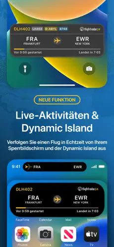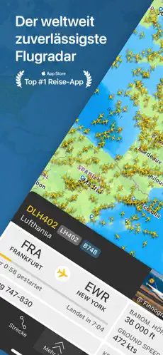 Die Flightradar24 App eignet sich, genauso wie die gleichnamige Webseite, für einen weltweiten Einblick in den Flugverkehr. Neben Informationen zu den ausgewählten Flugzeugen oder Helikoptern lassen sich auch verschiedene Flughafen-Infos, Wetterdaten und dergleichen mehr anzeigen. Eigene Flüge bzw. individuell ausgewählte Verbindungen können damit im Blick behalten werden, sogar als Live-Aktivität außerhalb der App.