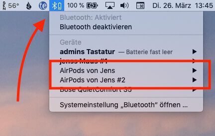 - Nun sollten die AirPods in der Geräteliste unter Bluetooth am Mac zu finden sein.