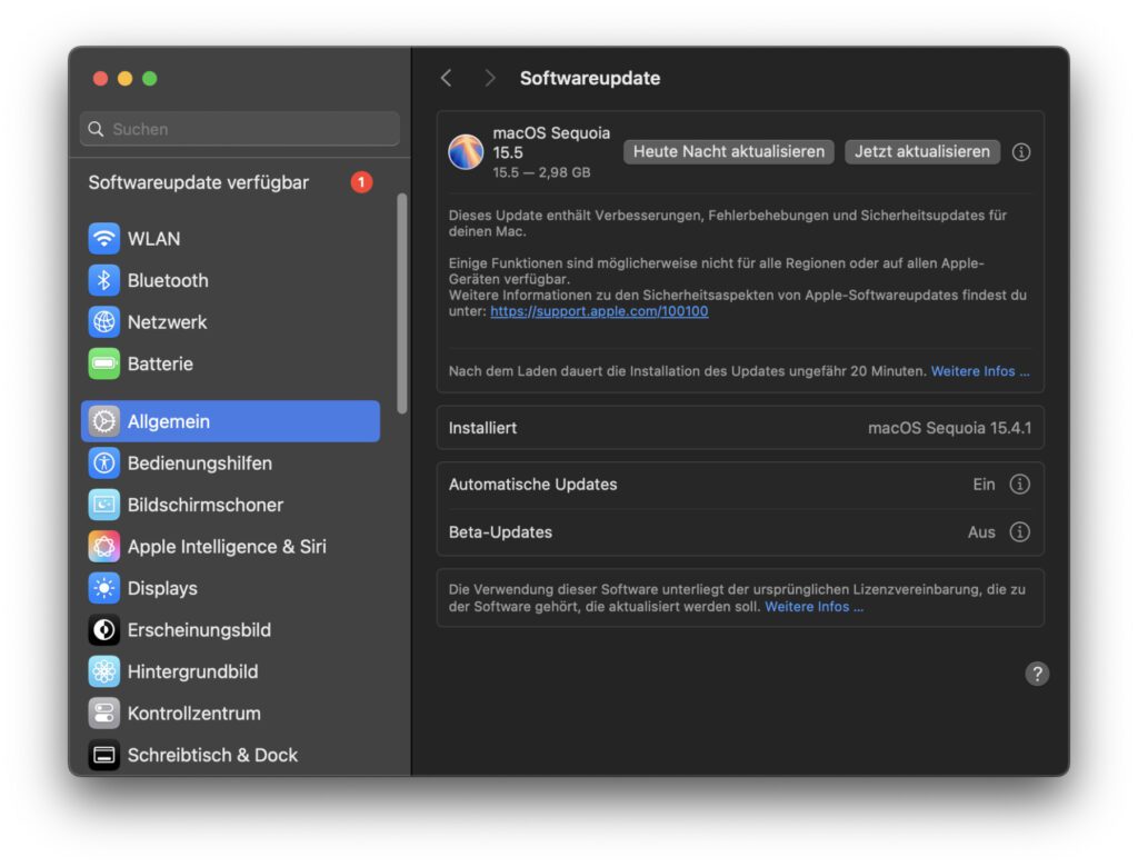Die Aktualisierung auf die Version 15.5 von macOS Sequoia lässt sich in den Systemeinstellungen unter Allgemein sowie dort unter Softwareupdate anstoßen. Größere neue Features werden für dieses Update nicht angegeben. Es heißt lediglich, dass es „Verbesserungen, Fehlerbehebungen und Sicherheitsupdates für den Mac“ enthält – also der bekannte Standardtext.