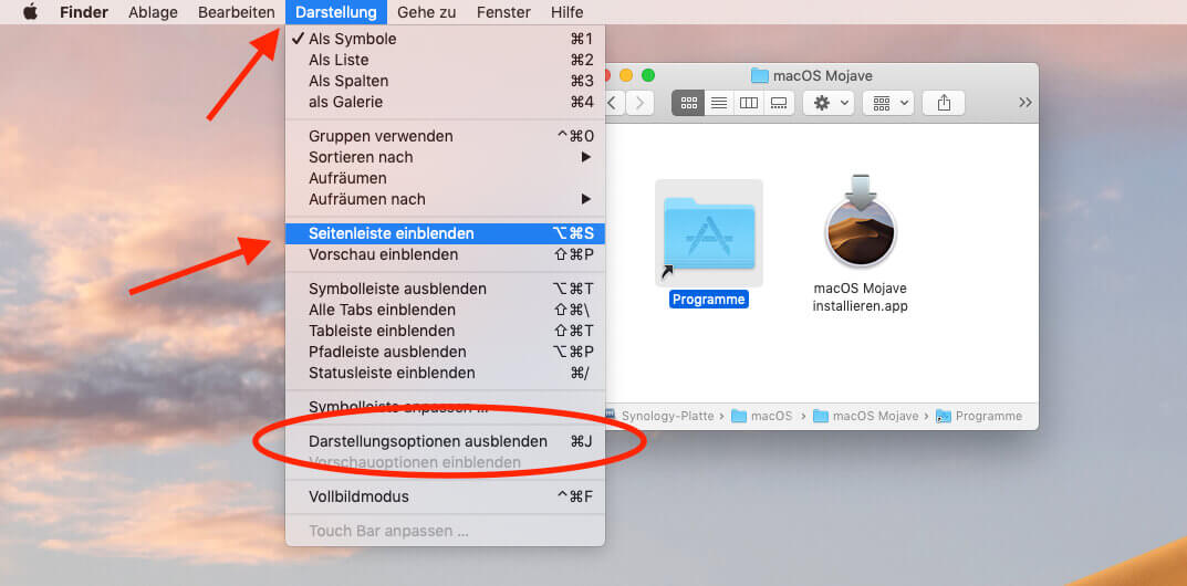 Möchte man zudem noch die Seitenleiste in dem Ordner ausblenden, klickt man das Fenster des Ordners an und geht im Finder auf das Menü "Darstellung" und findet dort den Punkt "Seitenleiste ausblenden". Alle Dinge, die man mit dem Ordner veranstaltet, werden mit der Erstellung des DMG-Files ebenfalls gesichert.