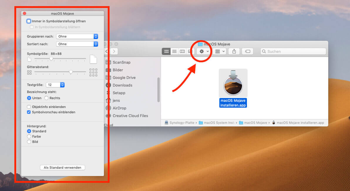 Über das Zahnradsymbol lässt sich das Fenster "Darstellungsoptionen" einblenden. Mit diesem kann man die Schriftgröße, den Ordnerhintergrund, die Symbolgröße und vieles mehr für den entsprechenden Ordner festlegen.