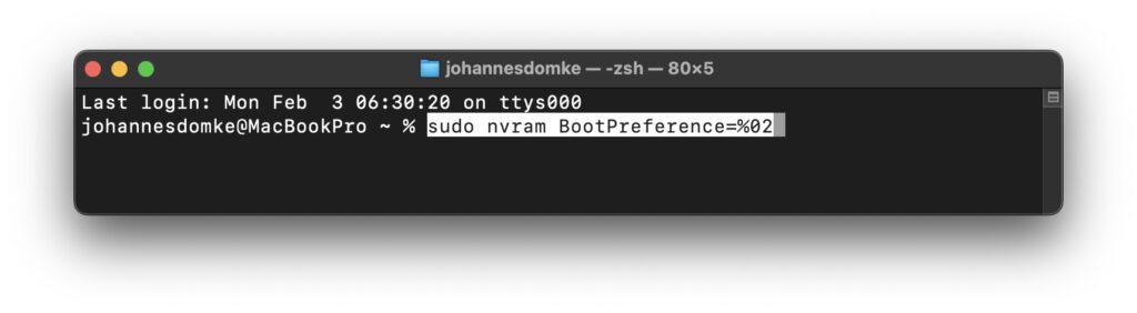 sudo nvram BootPreference=%02