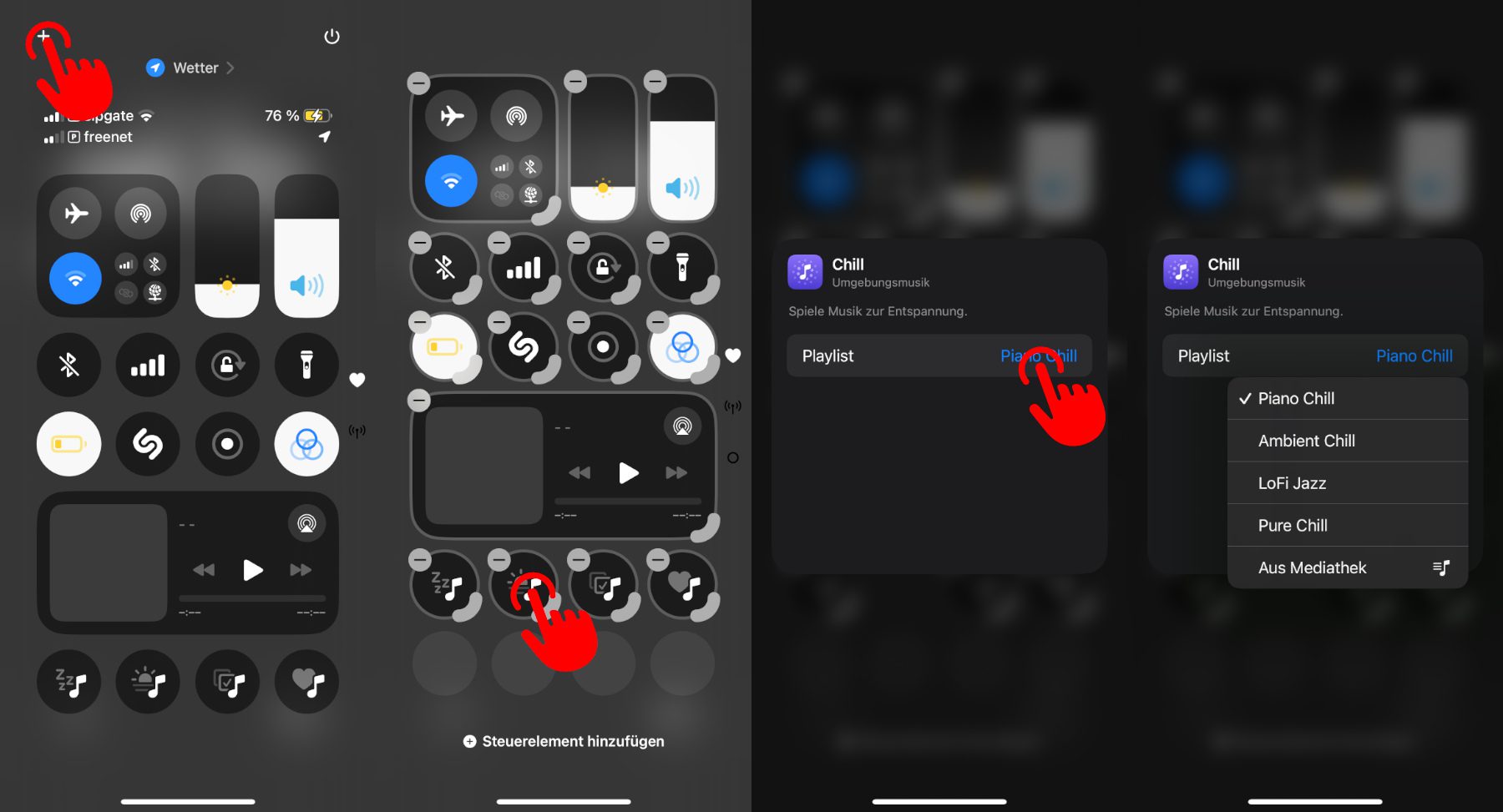 Um die Wiedergabelisten der vier Umgebungsmusik-Genres aufzulisten, kann man die im Kontrollzentrum abgelegten Buttons verwenden. Wie man sie dort platziert, zeige ich in der oben verlinkten Anleitung. Sind sie derart abgelegt worden, geht man für die Playlist-Auswahl folgendermaßen vor: