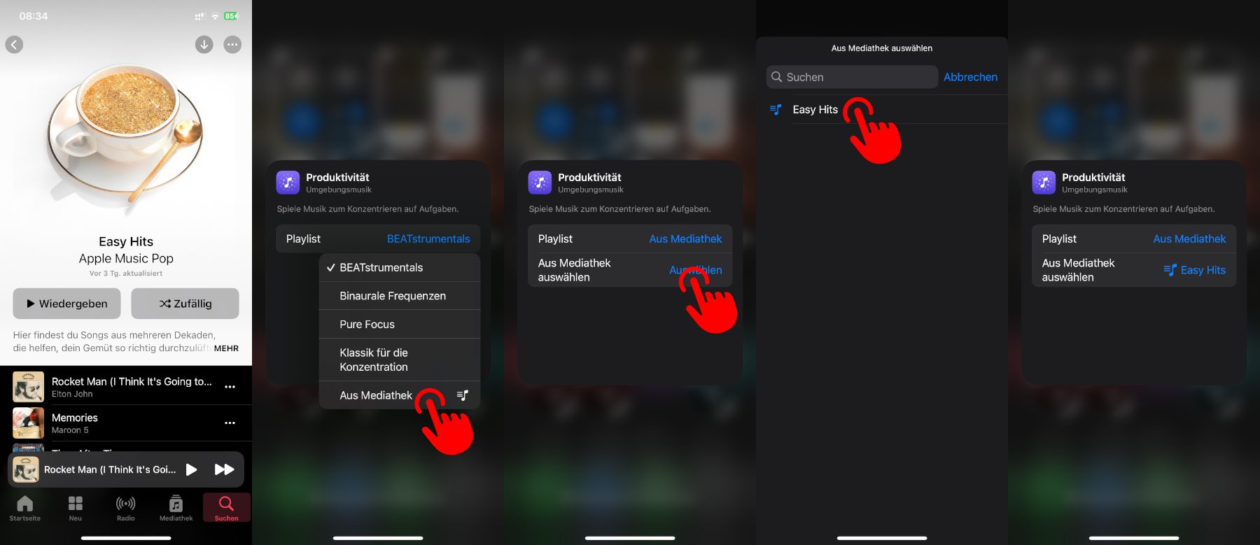 Anschließend habe ich aus der Liste der verfügbaren Wiedergabelisten (in diesem Beispielfall war es nur die eine) die „Easy Hits“-Liste ausgewählt. Diese wird nun automatisch wiedergegeben, wenn ich das entsprechende Symbol antippe. Die Umgebungsmusik-Knöpfe lassen sich also auch als Kurzbefehl-Alternativen zum schnellen Aufrufen von Lieblingsplaylists nutzen.