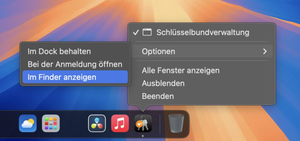 Zwar sucht man ab macOS 15 Sequoia vergeblich im Programme- und in dessen Dienstprogramme-Ordner nach der Schlüsselbundverwaltung-App. Aber da sie noch nutzbar ist, muss sie ja irgendwo abgelegt sein. Hat man sie über den oben beschriebenen Weg per Spotlight geöffnet, kann man für ihr Dock-Symbol per Rechtsklick das Kontextmenü aufrufen und dort Optionen -> Im Finder anzeigen auswählen.