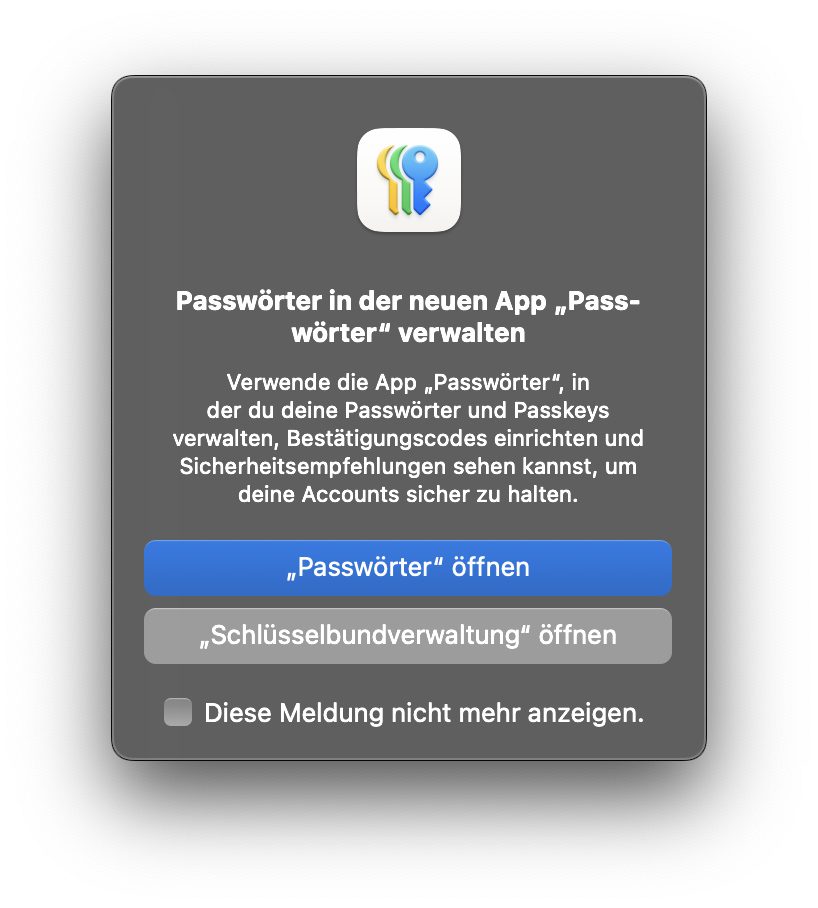 Anschließend wird man darauf hingewiesen, dass Passwörter nun in der neuen, extra dafür vorgesehenen App verwaltet werden können. Wer aber ab macOS Sequoia explizit nach der Schlüsselbund-App sucht, wird wahrscheinlich die Zertifikateverwaltung nutzen wollen. Zum Glück gibt es dafür den Button „Schlüsselbundverwaltung“ öffnen.