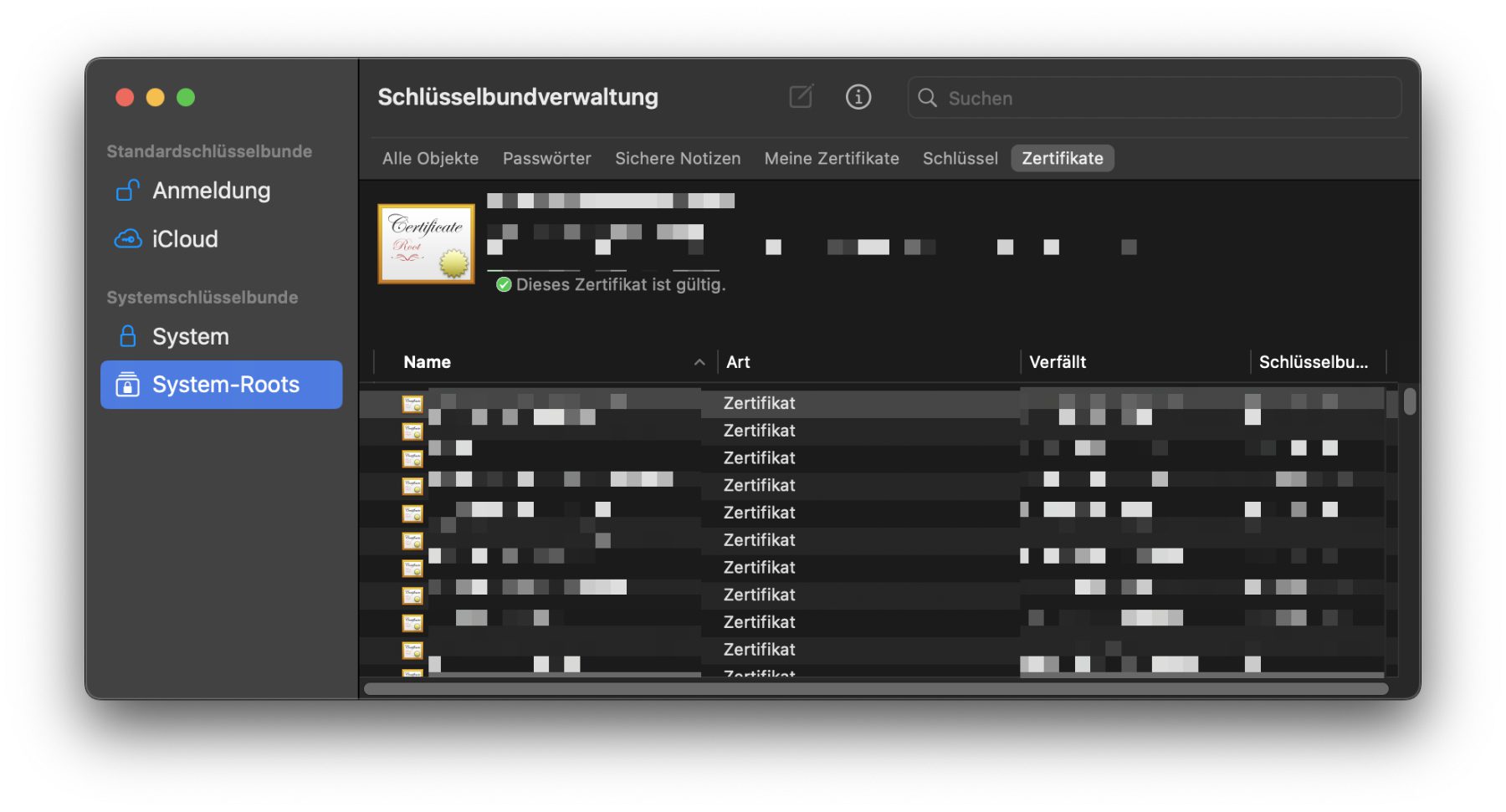 Hat man all diese Schritte hinter sich, ist man endlich am Ziel. Die Schlüsselbundverwaltung lässt sich nun für einen Einblick in die vorhandenen Zertifikate, ihre Infos und Daten nutzen. Auch die individuelle Verwaltung der digitalen Dokumente ist nun möglich.