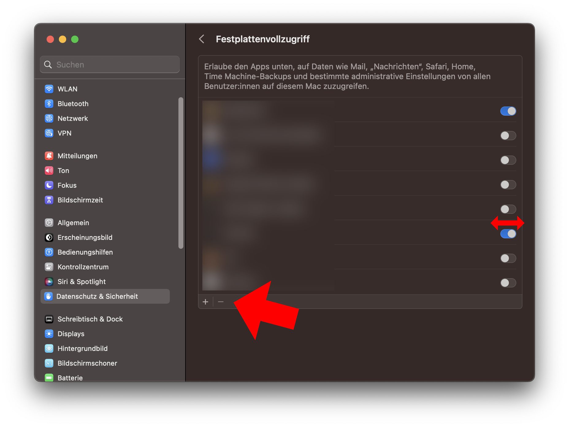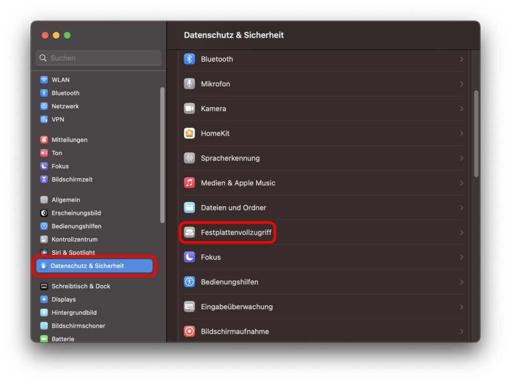 Die Liste der Anwendungen mit Festplattenvollzugriff ist komplett leer (keine Objekte). Ein Hinzufügen einer Anwendung über „+“ ist nicht möglich. Daher ist der Fall bei mir (iMac mit ChiP: Apple M1)) noch nicht gelöst.
