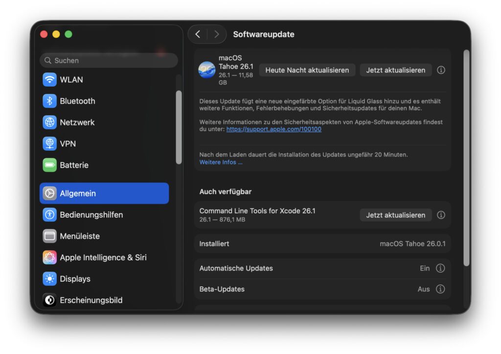 Klickt man sich durch die Sicherheitsupdate-Details unter https://support.apple.com/en-us/100100, dann findet man allein für macOS Tahoe 26.1 nicht weniger als 90 Einträge. Betroffen sind dabei unterschiedlichste Bereiche – von Kernel und Sandbox über WebKit und WLAN hin zu Fotos und Kurzbefehle. Die Installation der 26.1-Updates würde ich also unbedingt empfehlen!