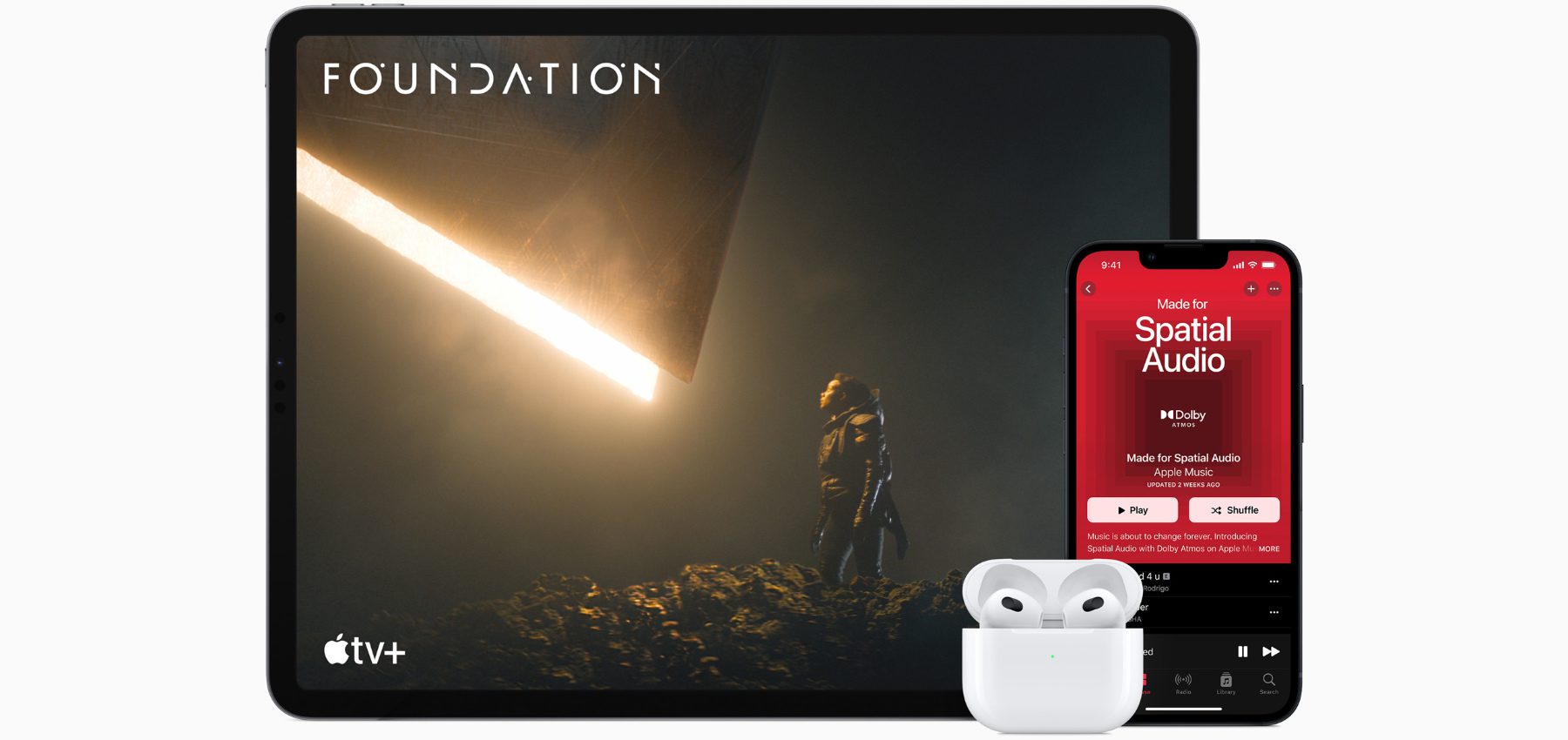 So verfügen die neuen Apple AirPods der dritten Generation jetzt über 3D-Audio („Spacial Audio“). Damit werden Musik, Filme, Serien und andere Inhalte noch immersiver. 3D-Audio kann auch vermittels Dolby Atmos in Apple Music genutzt werden. Beim Ansehen von Filmen, Serien und Videos auf Apple-Geräten kommt zudem Head Tracking zum Einsatz – und das bis zu sechs Stunden pro Akkuladung. Das Case hält weitere vier Akkuladungen. Wenn es mal schnell gehen muss, kann mit fünf Minuten aufladen eine Stunde Akkulaufzeit herausgeholt werden.