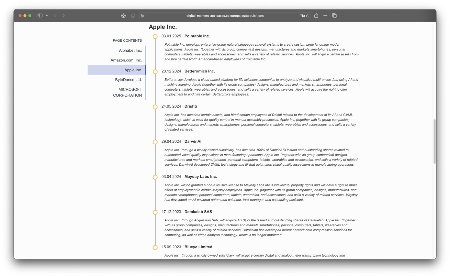 Die oben verlinkte Übernahme-Liste zeigt auf, welche Start-Ups und andere Unternehmen von großen Tech-Firmen in 2023, in 2024 und im laufenden Jahr 2025 aufgekauft wurden. Als Gatekeeper, also marktdominierende Unternehmen mit großer Handlungs- und Handelsmacht, sind dabei neben Apple auch Alphabet (Google-Mutterfirma), Amazon, ByteDance (TikTok-Mutterfirma) und Microsoft gelistet. Im Apple-Bereich werden derzeit sieben Übernahmen vom September 2023 bis Januar 2025 gelistet.
