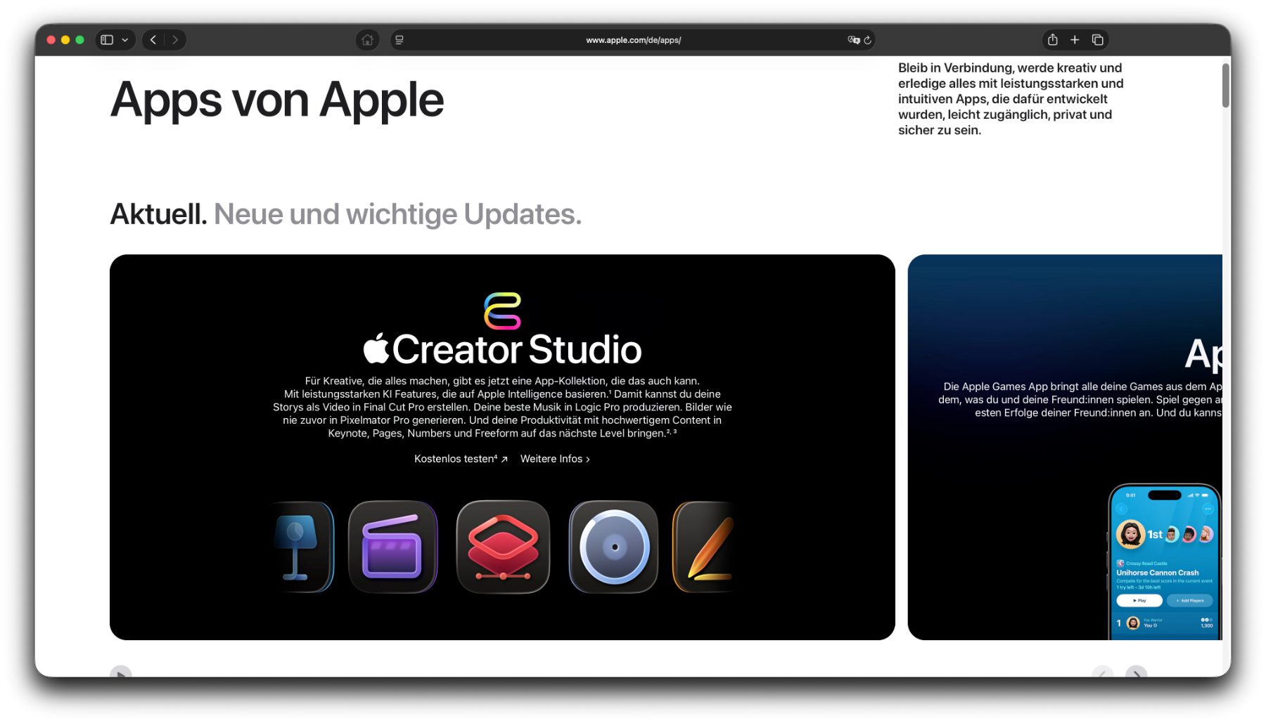 Derzeit besteht die erste Kachel dieser App-Übersicht des Mac- und iPhone-Herstellers aus einer Werbung für das Apple Creator Studio. Das Mitte Januar 2026 gestartete Abonnement enthält nicht nur KI-Funktionen für Numbers, Pages und Keynote, sondern auch den Zugang zu Profi-Software wie Pixelmator Pro (Bild- und Fotobearbeitung), Logic Pro (Musikerstellung), Final Cut Pro (Videobearbeitung und Filmschnitt) und dazu passenden Zusatzpaketen.
