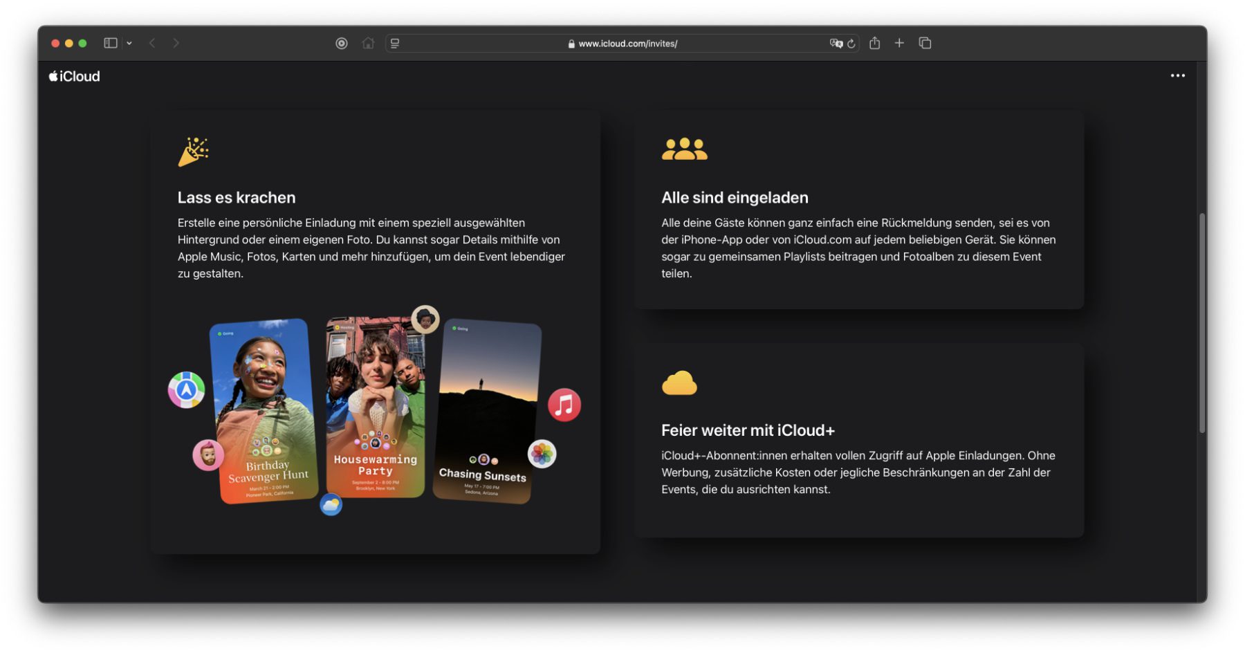Die Erstellung von Events und Zusammenkünften sowie das Aussenden der Einladungen erfolgt über die iPhone App. Apple gibt aber an, dass man auch über https://www.icloud.com/invites/ auf die einzelnen Einladungen und Events zugreifen kann. Testen konnte ich das freilich nicht, denn ich habe kein Abo für iCloud+.