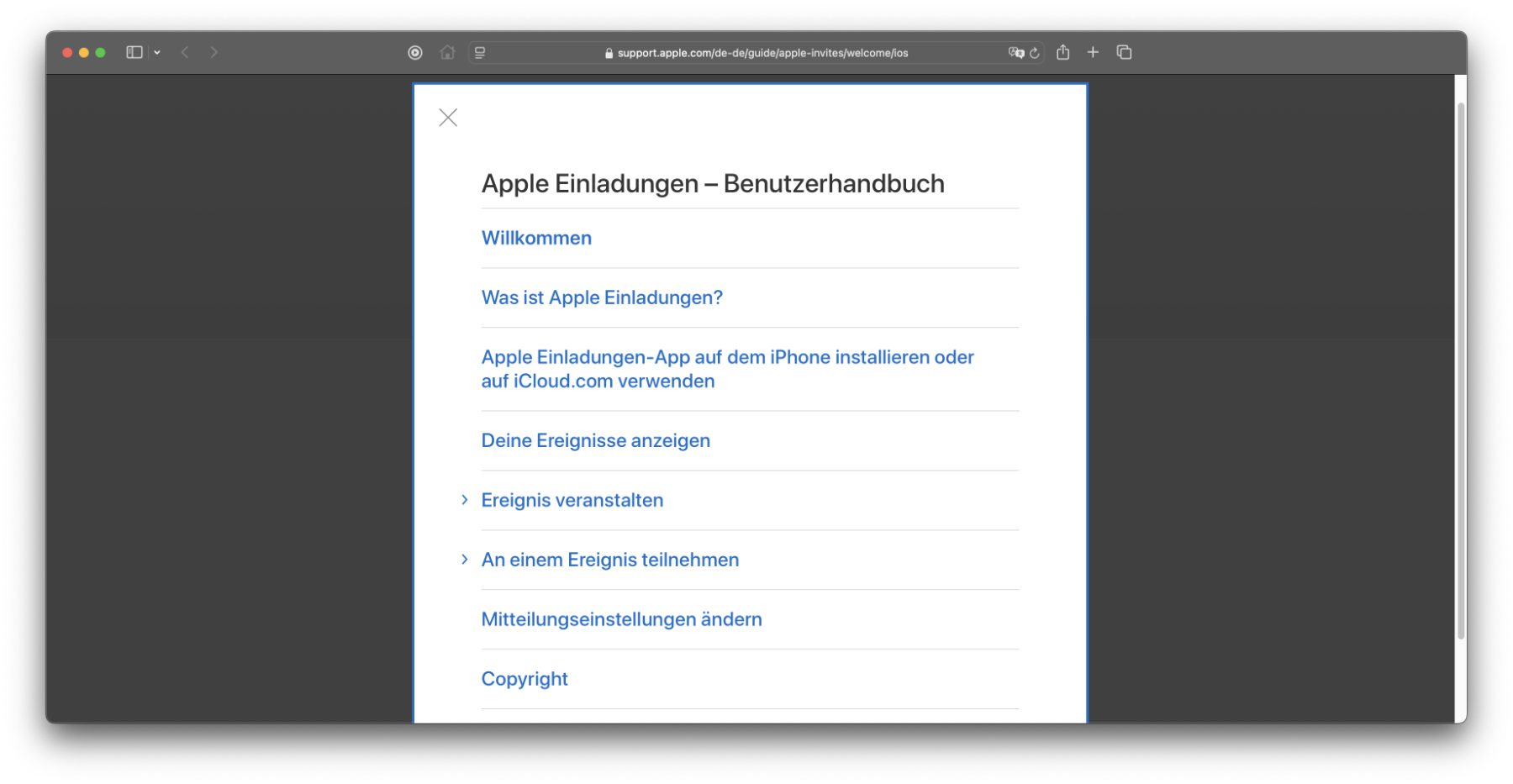 Unter der Überschrift „Apple Einladungen – Benutzerhandbuch für das iPhone und iCloud.com“ kann nach bestimmten Themen gesucht sowie ein Inhaltsverzeichnis ausgeklappt werden. Zudem werden im weiteren Verlauf die wichtigsten Themen aufgezeigt sowie einzelne Anleitungen verlinkt. Über das Inhaltsverzeichnis kommt man dabei zur Einleitung „Was ist Apple Einladungen?“, zur Hilfe für die Installation auf dem iPhone oder das Aufrufen in der iCloud, zu Anleitungen zum Erstellen, Teilnehmen, Ändern und Absagen von Events, und mehr.