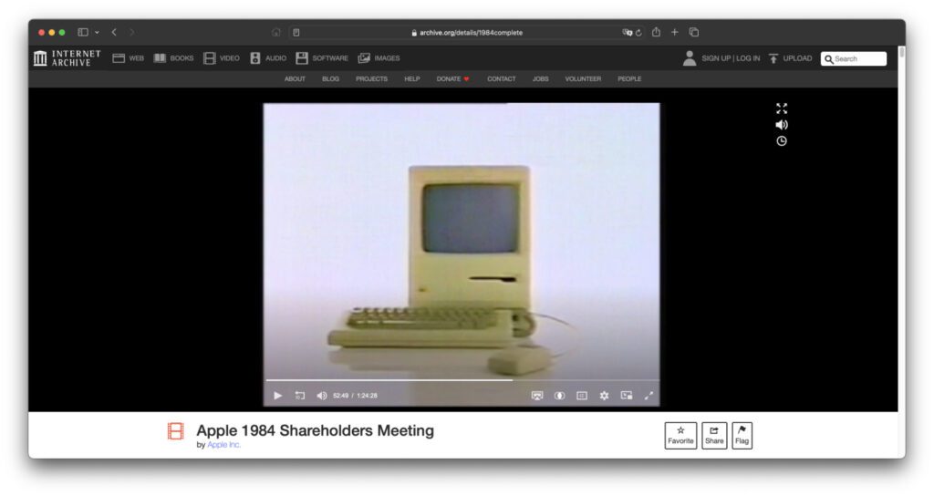 Natürlich nützt euch das Ganze nur etwas, wenn ihr die Podcasts App von Apple nutzen könnt. Auf weiteren Systemen zugänglich sowie direkt im Webbrowser aufrufbar ist hingegen das Internet Archive, das ich euch bereits hier vorgestellt habe: Internet Archive – Nutzungsmöglichkeiten des weltweiten Archivs. Auf der Webseite archive.org könnt ihr in das Suchfeld z. B. „Apple Event“ „Apple Keynote“ oder „Apple Special Event“ eingeben. Schon bekommt ihr zahlreiche Videos angezeigt, auch welche von vor 2007. Ihr könnt zudem nach einzelnen Events suchen, etwa nach dem Apple 1984 Shareholders Meeting. Neben dem Video gibt es auf dessen Seite sogar ein Transkript davon.