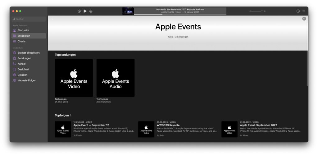 Neben dem Link zur Gesamtübersicht auf der „Apple Events“-Seite der Podcasts App gibt es auch noch die Möglichkeit, direkt zu den Audio- und zu den Video-Übersichten zu gelangen: Hier zu den Audios und hier zu den Videos. Meine Empfehlung ist dabei, unter der Folgen-Liste der verlinkten Seiten auf „Alle anzeigen“ zu klicken bzw. am Mobilgerät zu tippen. Denn dann werden nicht nur alle bisher hochgeladenen Inhalte angezeigt – sie werden auch chronologisch geordnet. So könnt ihr aktuell vom „Scary Fast“-Event vom 30. Oktober 2023 bis zur „Macworld San Francisco“-Keynote vom 9. Januar 2007 scrollen. Da wurde erstmals das iPhone vorgestellt.